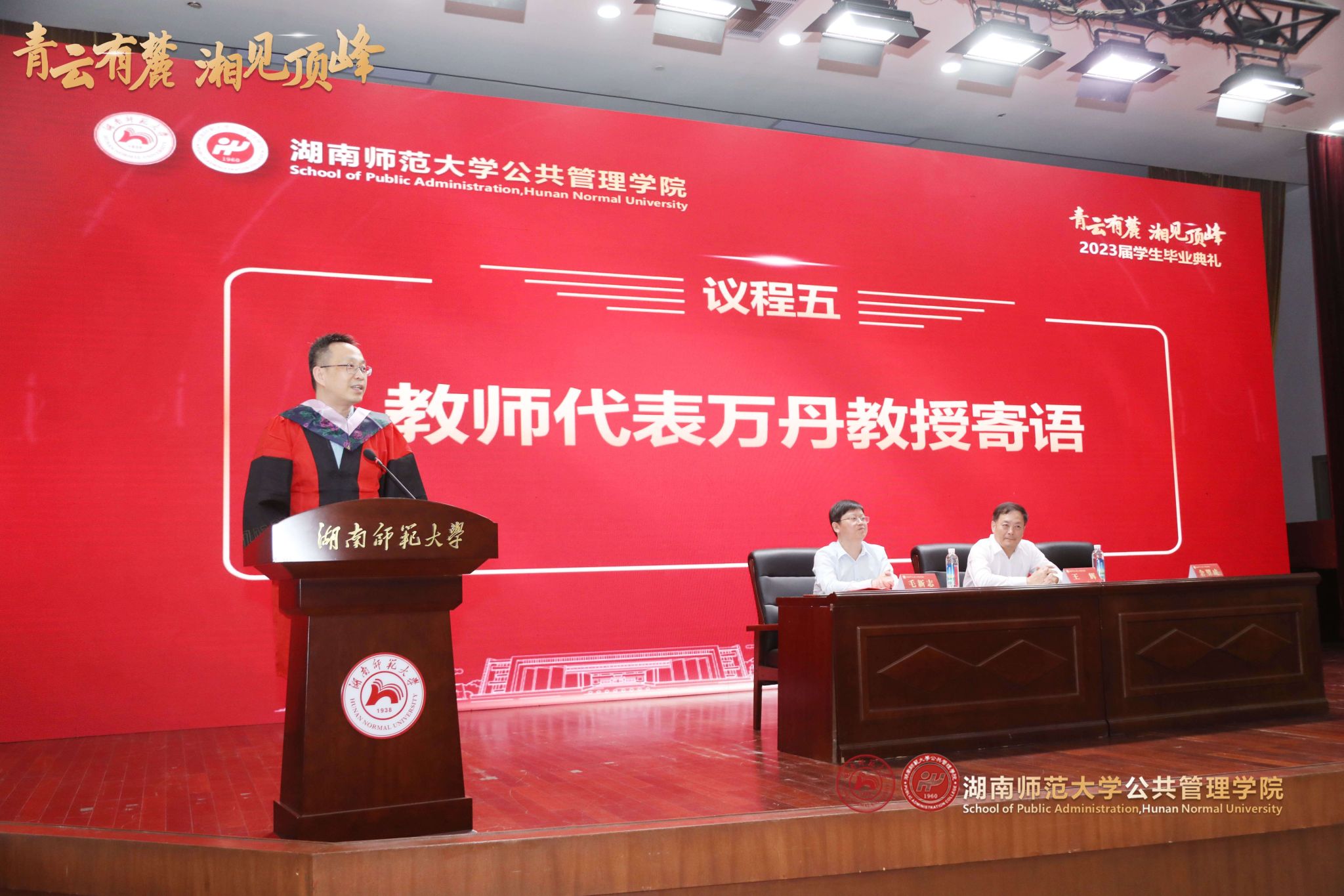 6月16日下午,365英国上市集团“青云有麓,湘见顶峰”2023届毕业典礼暨学位授予仪式在英国正版365首页国际学术报告厅隆重举行。学院党委书记余望成主持毕业典礼。英国正版365首页副校长王辉,校友总会副秘书长邝洁、贺慧星,社科处副处长李超民等学校和职能部门负责同志;365英国上市集团院长毛新志,道德文化研究院院长兼哲学系系主任向玉乔,院党委副书记孙雯波,主管科研副院长、政治学一级学科学位点负责人王敏,主管本科教学副院长苏静,主管行政副院长胡雪松,道德文化研究院副院长文贤庆,社会学系系主任、社会学一级学科学位点负责人罗忠勇,政治学与行政管理系系主任何琴等学院和学系负责人;哲学一级学科学位点负责人张怀承、政治学科科学社会主义博士点负责人周小毛、社会工作专业硕士点负责人孙建娥、MPA专业硕士点负责人刘茜等学位点导师代表以及本科毕业生班导师、研办和学工办的老师出席毕业典礼。