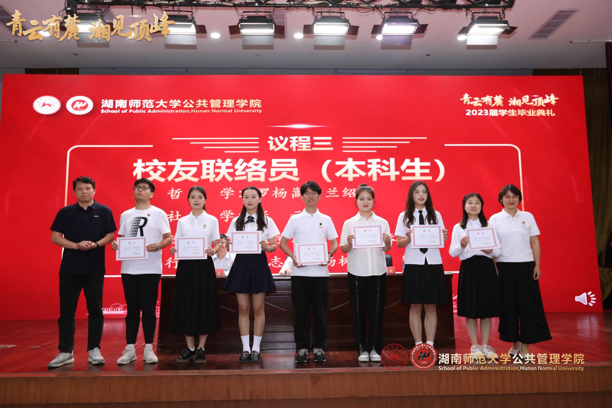 主持人余望成书记依次宣读2023届毕业研究生和本科生校友联络员名单;校友总会副秘书长邝洁、贺慧星,学院副院长胡雪松、党委副书记孙雯波分别为校友联络员颁发聘书并合影留念。
