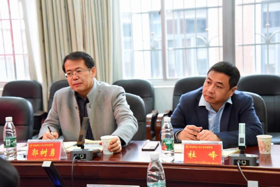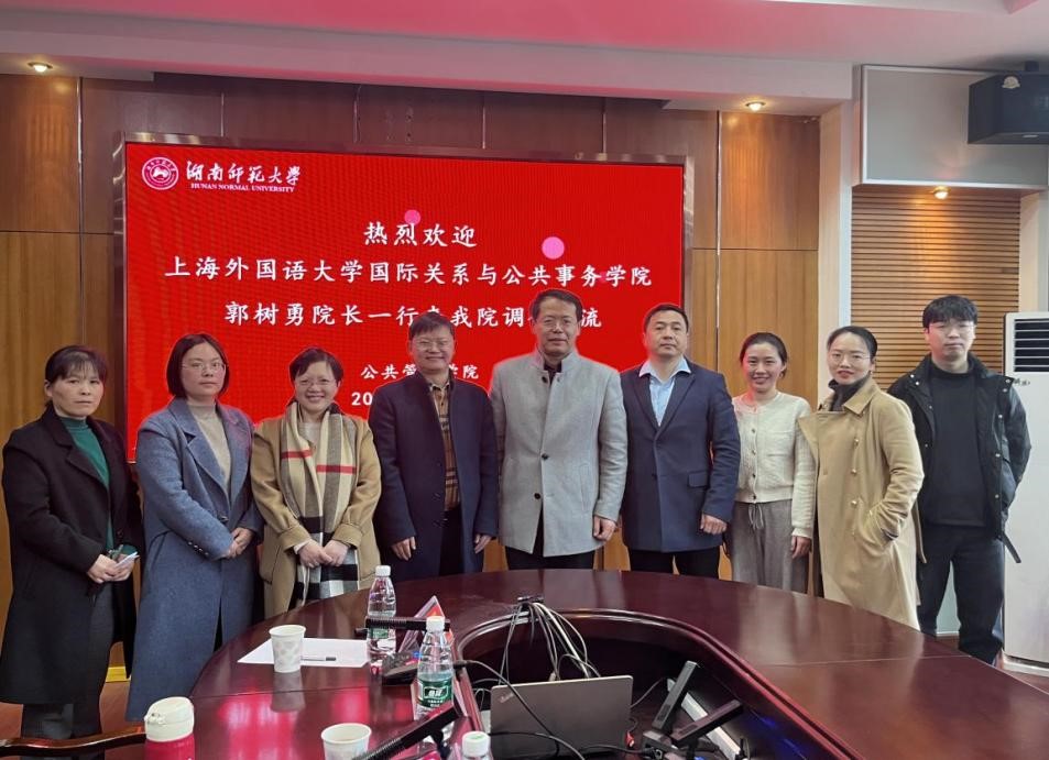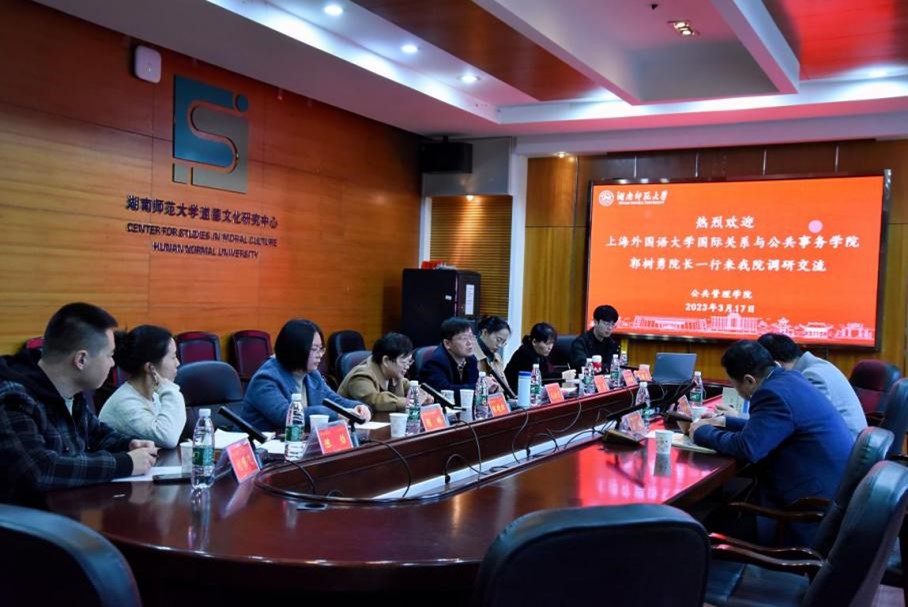 会议伊始,毛新志院长对郭树勇院长一行的到来表示热烈欢迎,就我院的历史沿革、365英国、育人体系建设等方面进行了简要介绍。他表示,我院历来重视学生的招生、教育、管理和就业等一体化培养工作,以切实提高学生综合素质为目标,希望两个学院能够保持高效交流,共同推进教育事业稳步发展。陈晓红教授介绍了我院国际政治专业的建设发展,她表示自身与上海外国语大学有着深厚的友谊,希望能继续保持友好往来,加强深入探讨,为学科发展贡献力量。刘茜副教授从MPA教育中心的招生情况、师资力量、专业课程等方面进行了详细介绍。她指出,我院MPA教育中心始终坚持在规范中求创新、在发展中求特色,努力打造成湖南省、全国性的教育品牌。颜琳副教授从自身的研究兴趣、研究领域及相关成果等方面进行了简要介绍,表示要紧跟国际发展方向和热点话题进行科学研究。