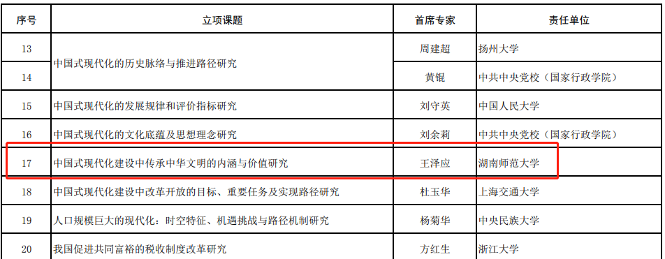 王泽应教授申报的课题“中国式现代化建设中传承中华文明的内涵与价值研究”成功立项研究阐释党的二十大精神国家社科基金重大项目。