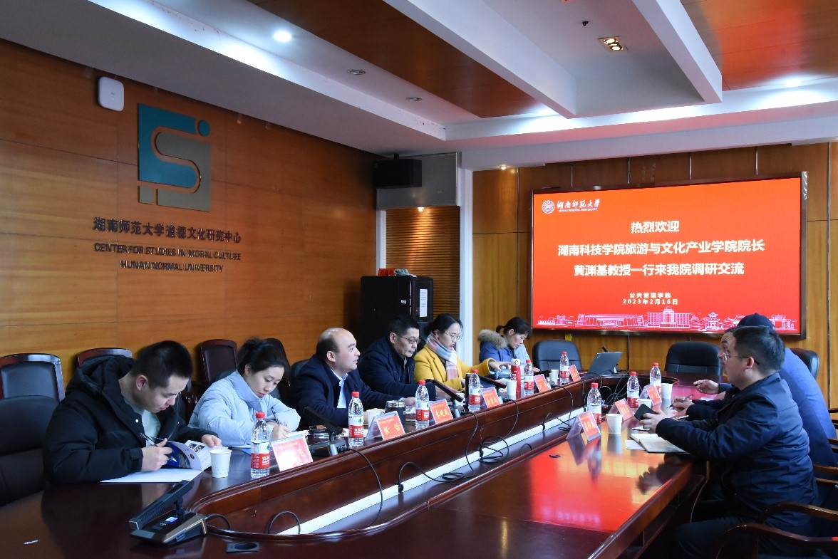 (通讯员 曹玥)2023年2月16日下午,湖南科技学院旅游与文化产业学院院长黄渊基、副院长蔡保忠、系主任刘进一行莅临我院调研交流。我院党委书记余望成、研办主任陈怡、石娉婷老师、胡耀飞老师以及学校社科处副处长李超民教授、校MPA教育中心副主任刘茜老师出席会议。会议由李超民主持。