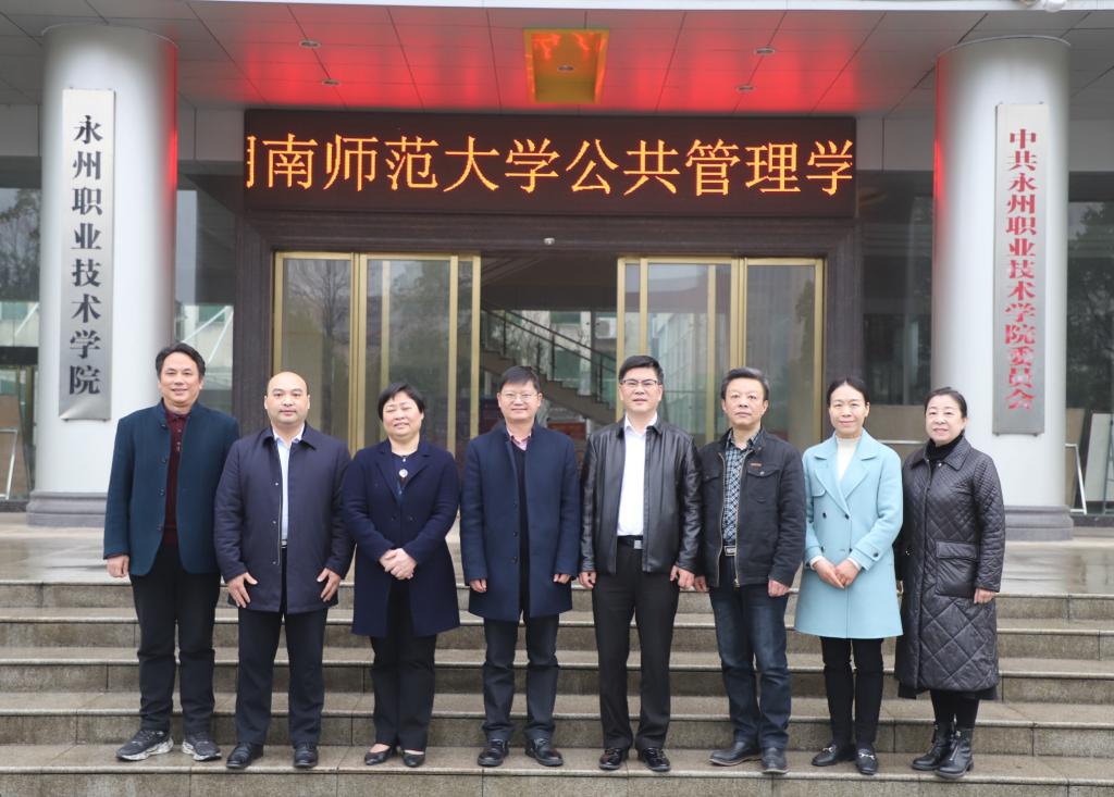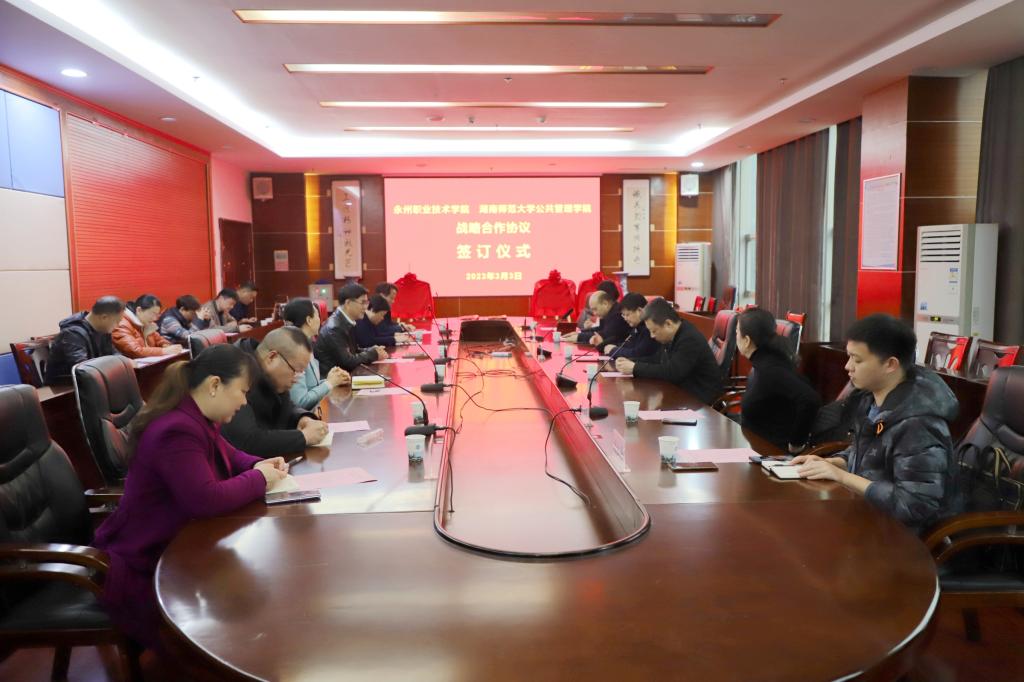 3月3日,我院与永州职业技术学院(以下简称:永州职院)战略合作协议签约仪式暨揭牌仪式在永州职院顺利举行。永州职院党委书记黄小明、党委副书记、校长郑文飞、党委委员、副校长裴有为、永州职院继续教育学院院长唐明朝、副院长肖忠、郭凌云、我院院长毛新志教授、副院长胡雪松、我校社科处副处长、博士生导师李超民教授、我院社会学系胡建新副教授、成教办王群主任出席。签约仪式由永州职院郑文飞校长主持。