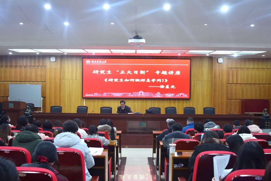 接着,徐晨光教授为与会研究生带来了题为《研究生如何做好真学问?》的学术讲座。徐教授从选择、偶像、目标、态度、奋斗、坎坷、好学、勤奋、结果和人生十个方面出发,为同学们深入浅出地讲述了他的人生历程、学术思路、工作经验、生活哲学。首先,徐教授以“选择”为切入点,结合自身经历,告诉同学们在学术研究过程中需要做怎样的选择、怎样做好选择以及如何忠于自己的选择;第二,学习需要有“态度”,要做起而行之的行动者、攻坚克难的奋斗者;第三,学习需要有“方法”,做到博采众长、学科交叉、点面结合,同时也要术业有专攻,掌握独门绝招,克服困难,在接续奋斗中获得出彩机会。