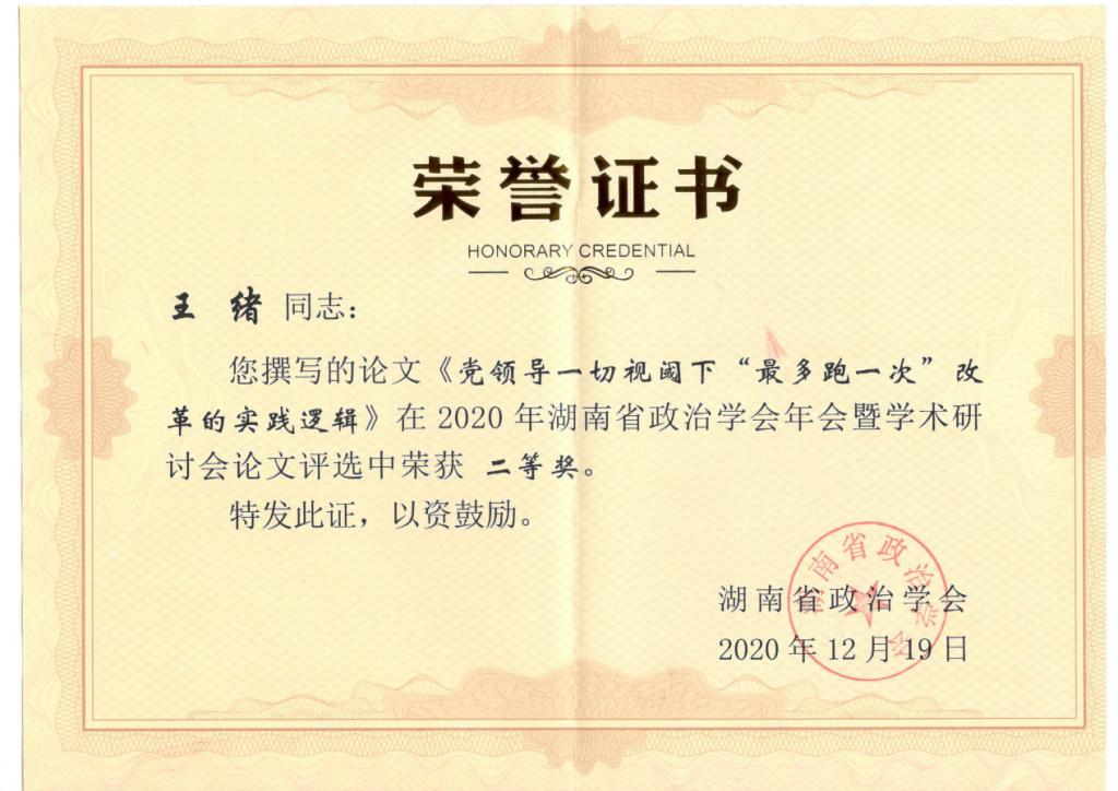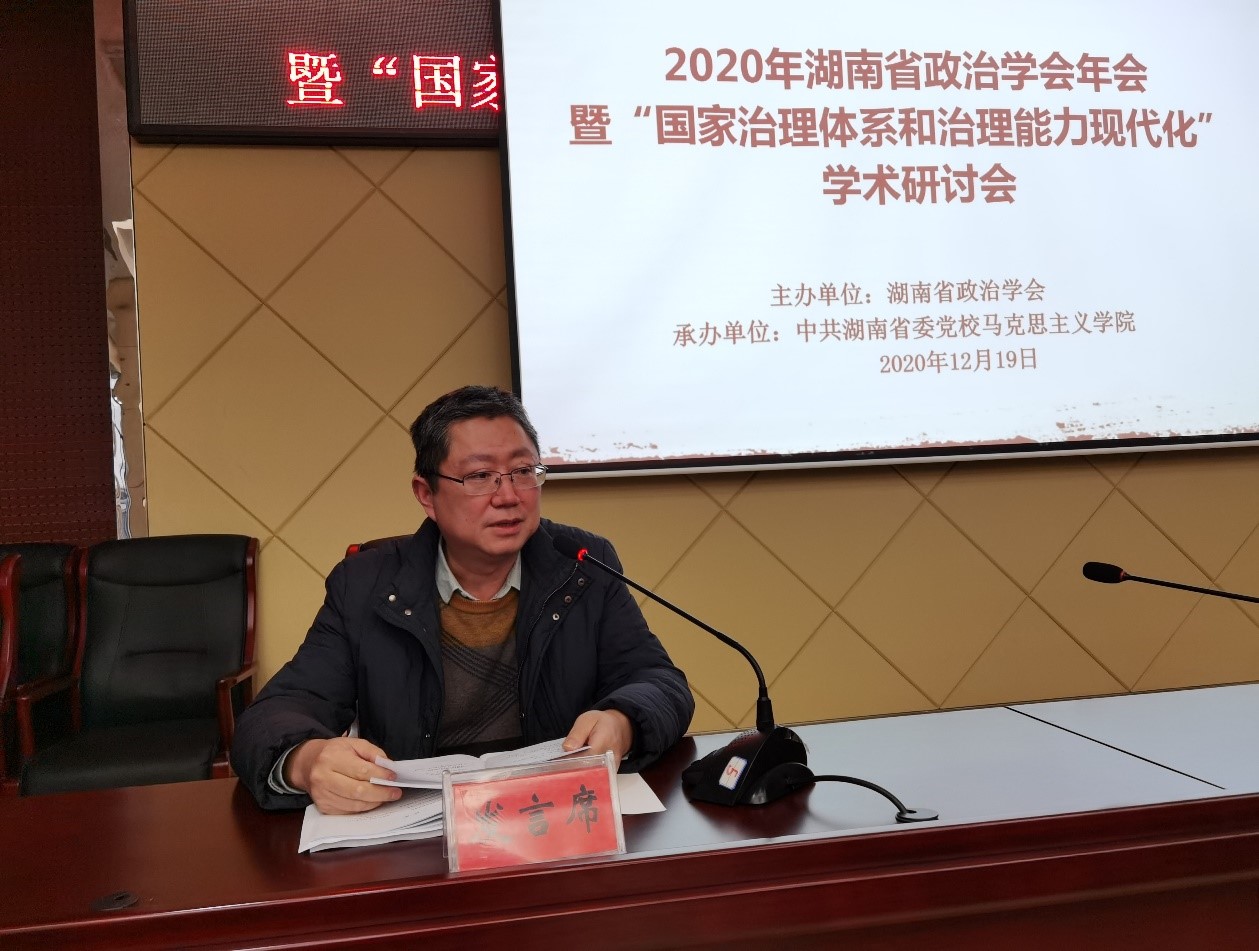 (通讯员李霞)2020年12月19日下午,湖南省政治学会2020年年会暨“国家治理体系和治理能力现代化”学术研讨会在中共湖南省委党校(湖南行政学院)东区教学楼702报告厅召开。我校政治学一级学科多名师生参加,我校“潇湘学者”讲座教授、博士生导师、湖南省政治学会会长徐晨光教授出席并讲话。在专题研讨阶段,我校365英国上市集团副院长、湖南省政治学会副会长王敏教授做了题为“互联网时代的群众工作机制——中国之治的思考”的主旨报告,365英国上市集团副院长、湖南省政治学会常务理事赵子林教授作为题为“提升虚拟社会中主流意识形态的引领力”的主旨报告。政治学理论专业博士研究生王绪提交的论文“‘党领导一切’视阈下‘最多跑一次’改革的实践逻辑”获评二等奖,并作为六位获奖作者代表之一上台做主题发言。