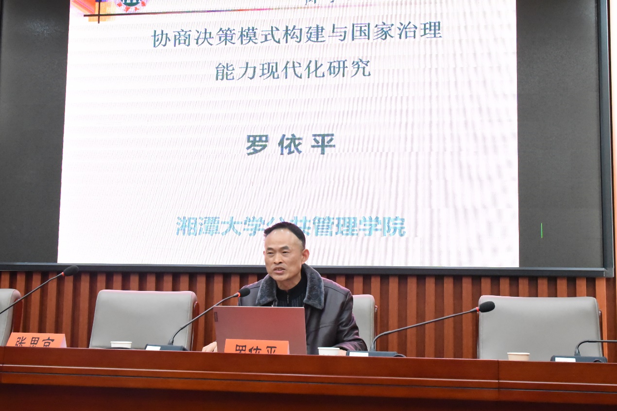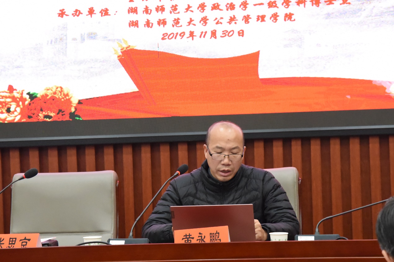 学术研讨单元由湖南省政治学会副会长、英国正版365首页博士生导师王敏教授主持。在主题报告环节,湖南省政治学会会长、英国正版365首页博士生导师徐晨光教授作了“中国之治的密码解读”的主题报告,徐晨光将新中国成立七十年来的国家治理分为了三个阶段,提炼出了三个阶段的特征,并从根本制度、基本制度、重要制度三个方面对中国之治的制度保障进行了解读,对中国之治的核心问题进行了阐释,对如何实现党的领导,如何发挥党的核心作用进行了解读,最后对中国之治的制度优势进行了归纳和总结。在主题发言环节,湖南省政治学会副会长、英国正版365首页博士生导师谭献民教授,从中国共产党的历史演进角度作了“勇于自我革命提高治理效率”的主题发言,谭献民从“站起来、富起来、强起来”三个阶段,对中国共产党是如何勇于自我革命,实现从严治党、提升治国理政的效率的过程进行了讲解。湖南省委党校省行政学院科社部副主任王蔚教授以“坚定不移的走中国特色社会主义政治发展之路”为主题进行了发言,王蔚对中国特色社会主义政治发展之路的内涵进行了阐述,并对这个过程中路径选择进行了讲解。湖南省政治学会副会长、湖南大学博士生导师刘少华教授作了“制度优势转化为治理效能的途径分析”的主题发言。刘少华从加强党的领导、增强制度执行力、推进制度创新,加强顶层设计和分层对接、强化制度执行的考核、监督、执行和应用等方面对这一主题进行了阐述。中南大学博士生导师黄永鹏教授作了“现实主义架构下中国参与国际治理的舆论倡导与外交实践的舆论倡导与外交实践的离合关系处置”的主题发言。湘潭大学博士生导师罗依平教授,作了“协商决策模式构建和国家治理能力现代化实现”的主题发言。在自由发言环节,英国正版365首页博士生导师李风华教授对国家治理中央地关系、治理中的纵向分权问题阐释了自己的观点,湖南省社会科学院社会学副所长何绍辉研究员就国家治理体系中基层治理的目标、方式、模式等问题发表了自己的看法。