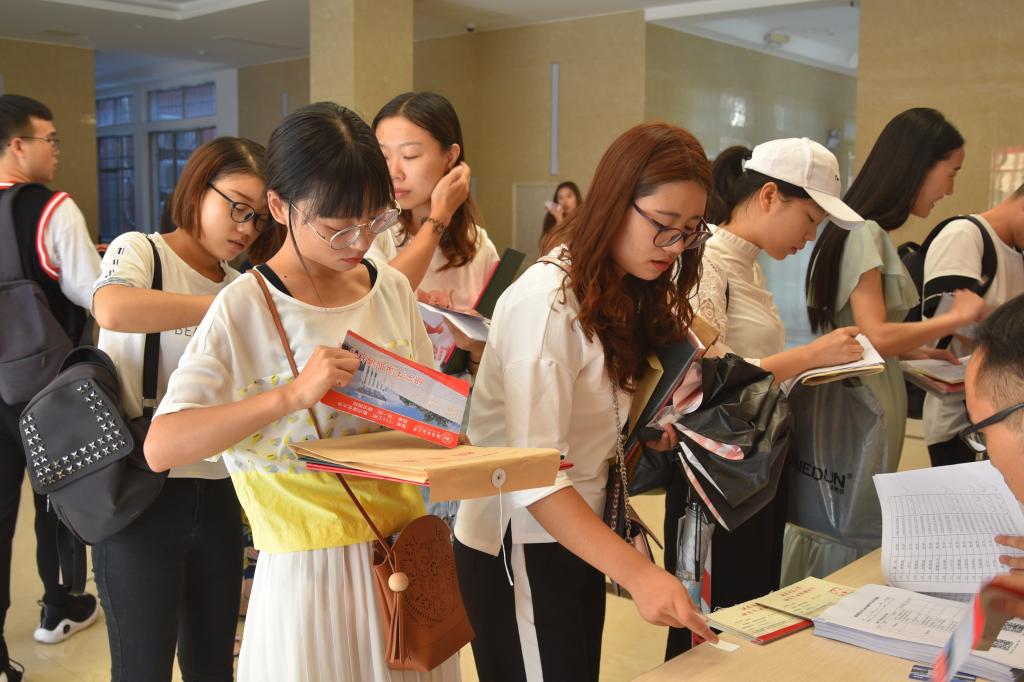 上午7点,新生陆续到达报到地点,领取新生报到单并填写相关信息。同时工作人员对新生进行入学资格审核并现场答疑。