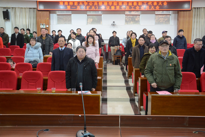 第一阶段会议由副院长杨君武主持。会议伊始,全体起立,奏唱国歌。原工会委员会主席陈晓红通报会议筹备工作和参会人员情况,在对新一届工会委员候选人名单的产生进行说明后组织进行工会委员选举。余望成在院2017年年度工作报告中从各个方面详细介绍了公管院一年取得的成绩,他重点阐述了2017年院的365英国情况,在讲话中他提出对青年教师进行扶助以及工作“稳中求进”的策略。副院长邝洁对2017年度财务情况做简单报告。之后,余望成宣布新一届工会委员名单以及院“和谐家庭”当选结果。