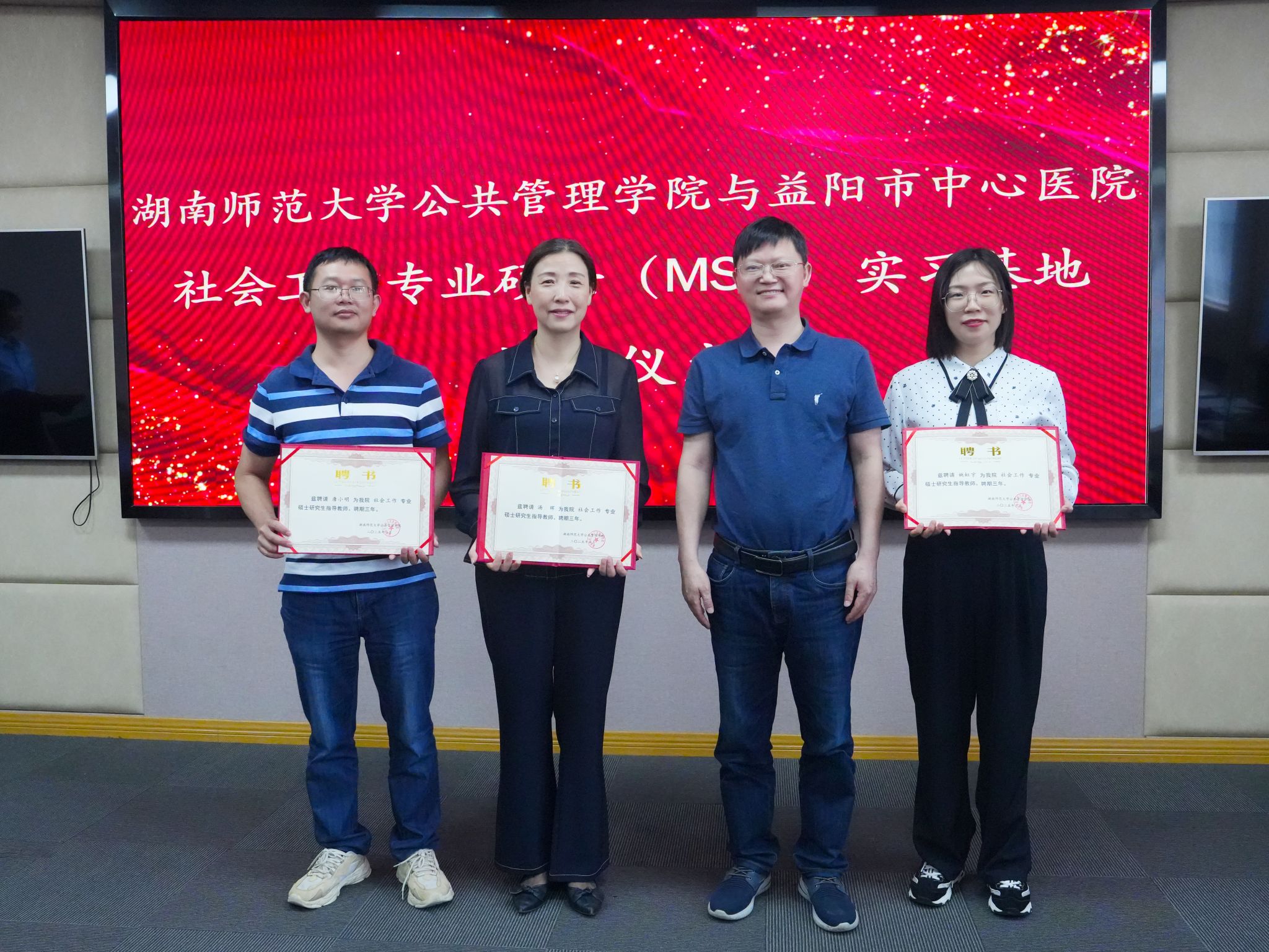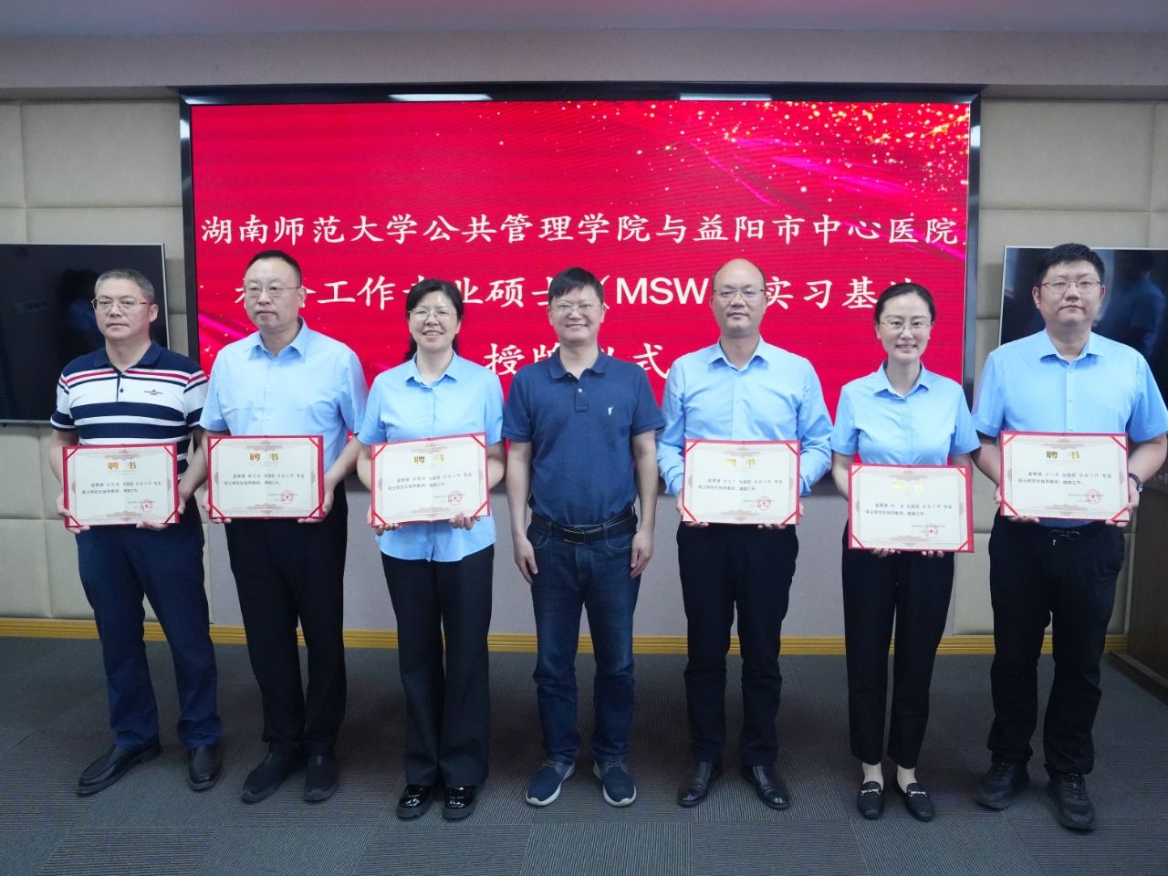 会议最后,毛新志院长首先向中共益阳市委社工部和益阳市中心医院两家单位授牌,随后向两家单位相关人员颁发社会工作硕士指导教师聘书。