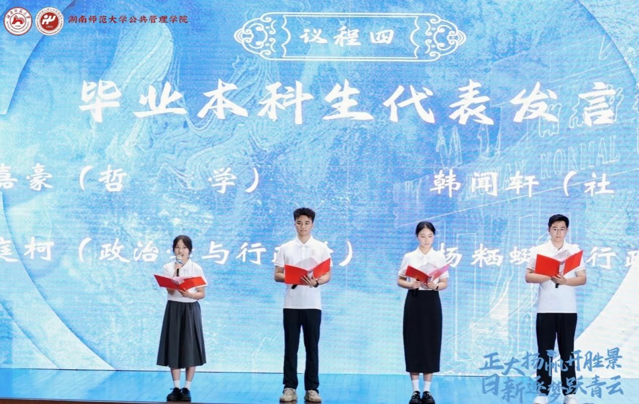 本科生毕业生代表陈嘉豪、韩闻轩、胡庭柯和杨粞蜓发言,他们追忆了学习期间专业学习、社会实践、学科竞赛等方面的成长历程,表示将铭记母校教诲,勇担时代使命,以奋斗之姿在新征程上发光发热。