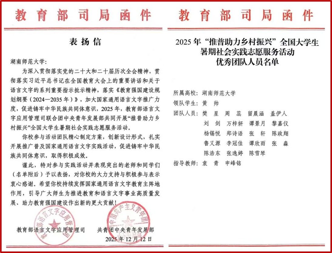 (通讯员 黄帅 刘剑 谭欣雨)近日,由政治学与行政管理系副教授袁青老师、辅导员申峰铭老师指导的“奋楫者”暑期社会实践团队被教育部语言文字应用管理司、共青团中央青年发展部联合发函表彰。团队在2025年“推普助力乡村振兴”全国大学生暑期社会实践志愿服务活动中的表现突出,成效显著,获评优秀团队。