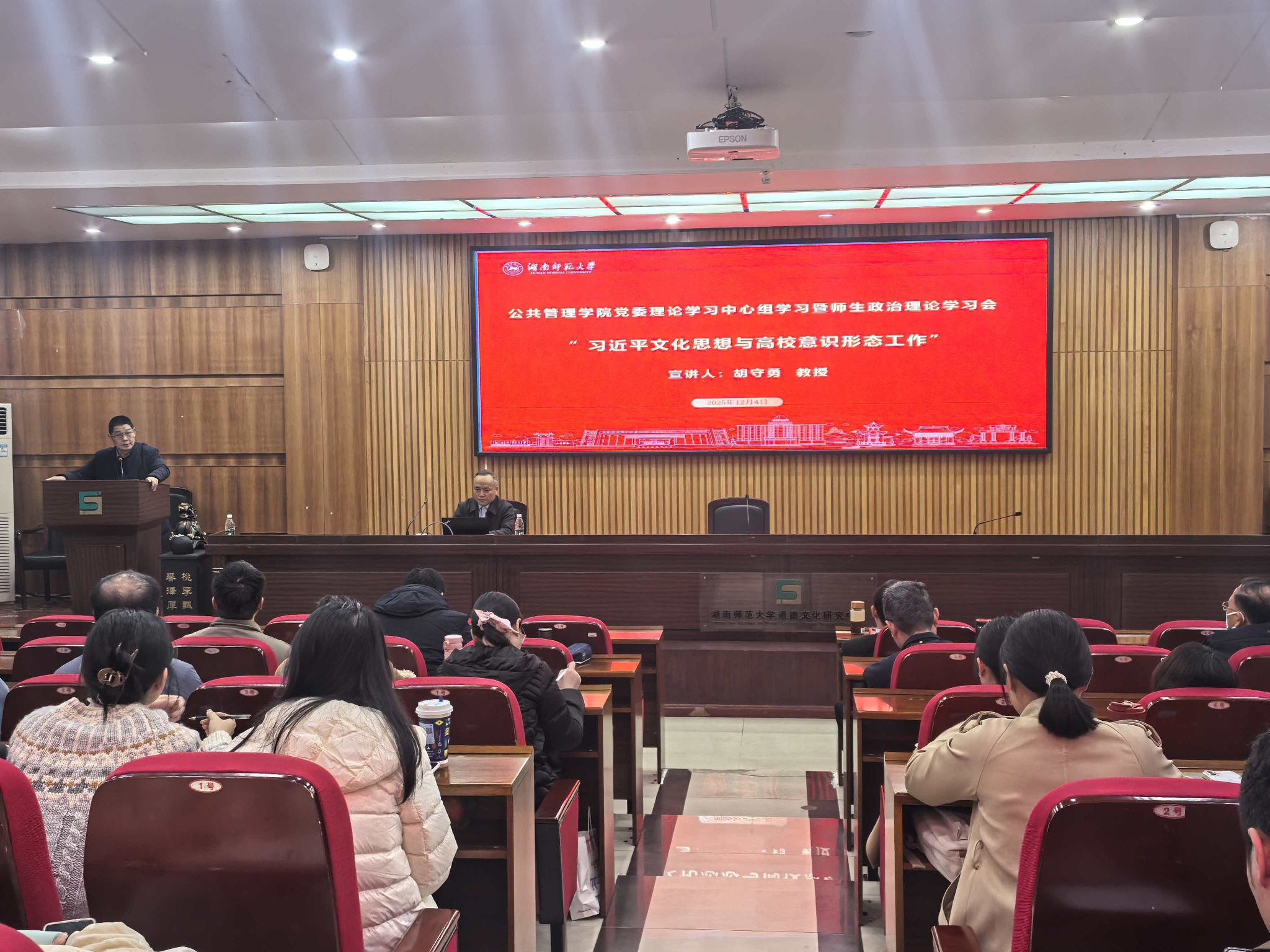 师生政治理论学习邀请学校党委讲师团成员、我院教师胡守勇教授宣讲“习近平文化思想与高校意识形态工作”。他系统梳理了习近平文化思想的形成脉络与实践要求,深入解读“两个结合”“十四个强调”“七个着力”的核心要义与时代价值;从政治引领、文化传承、风险防范三个维度深刻阐释了高校作为意识形态前沿阵地的战略定位;深入剖析新时代面临的多元价值冲击等现实挑战与切实加强高校意识形态工作的实践路径。他强调,全体师生要把学习贯彻习近平文化思想转化为行动自觉,以文化人、以文育人,为强国建设、民族复兴凝聚强大精神合力。