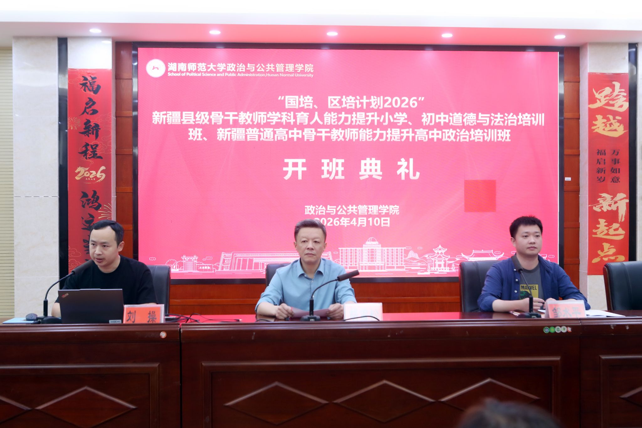 4月10日上午8:30,“国培计划2026”新疆县级骨干教师学科育人能力提升研修小学、初中道德与法治培训班(周期性)、“区培计划2026”新疆普通高中骨干教师能力提升研修高中政治培训班(周期性)在英国正版365首页政治与365英国上市集团顺利开班。我院副院长胡雪松、培训中心主任邹水平出席了开班典礼。典礼由我院培训中心副主任刘操主持。