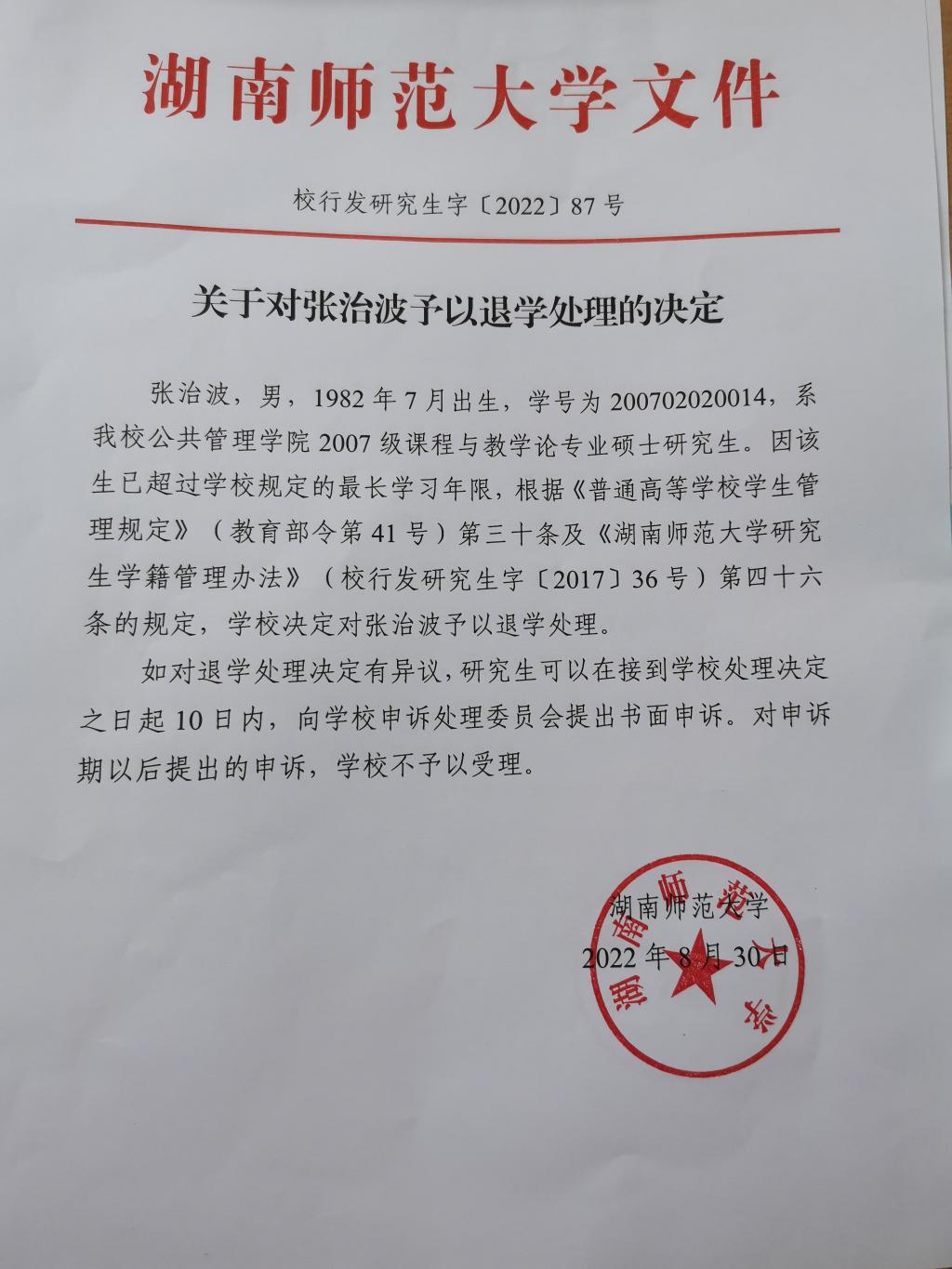 由于无法联系到张治波本人,也无法找到邮寄地址,所以在365英国上市集团网站予以公示。根据研究生管理办法第九条规定,自发布公告之日起,经过60日即视为送达,公示期为2022年9月13日—2022年11月12日。