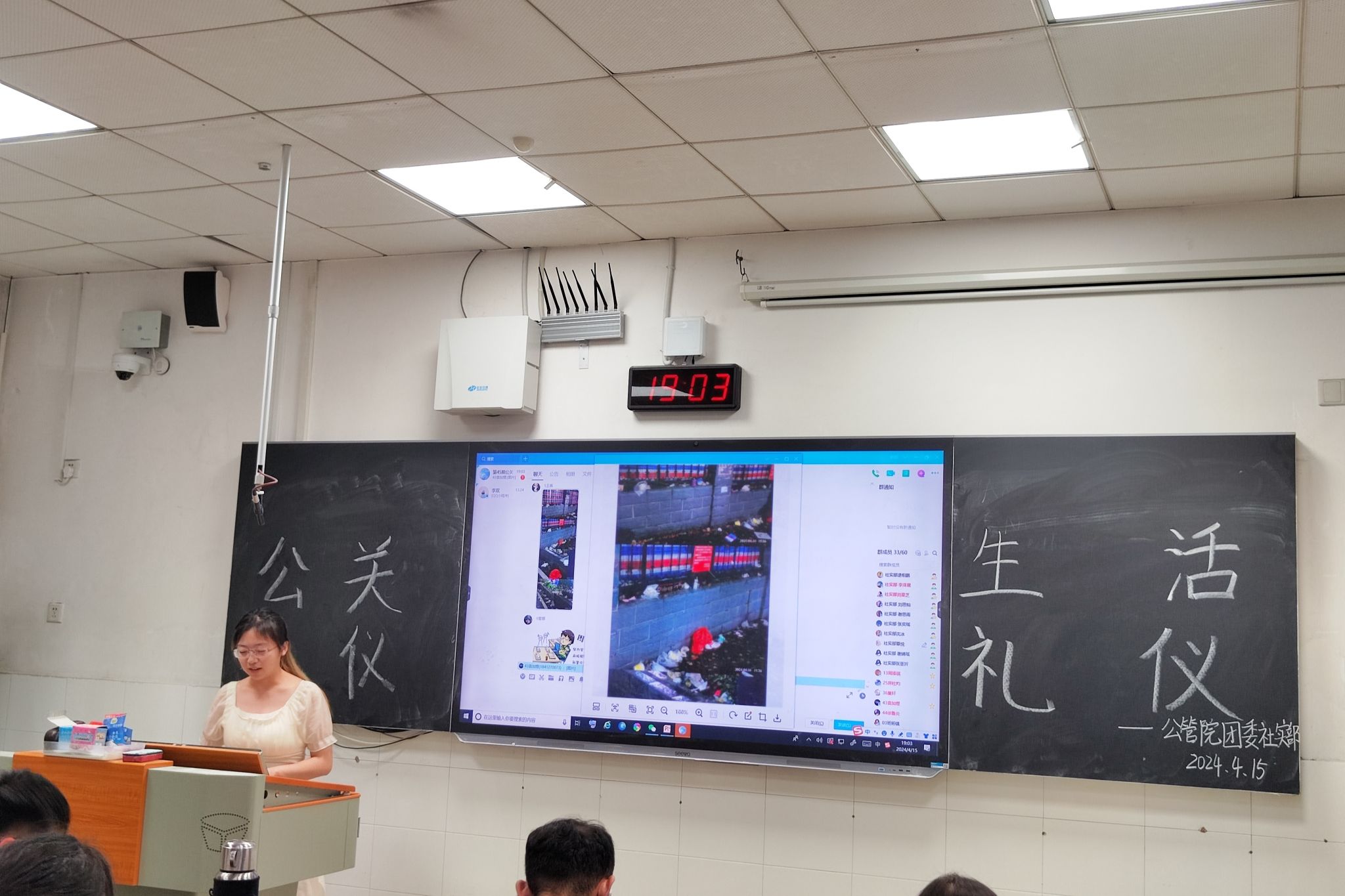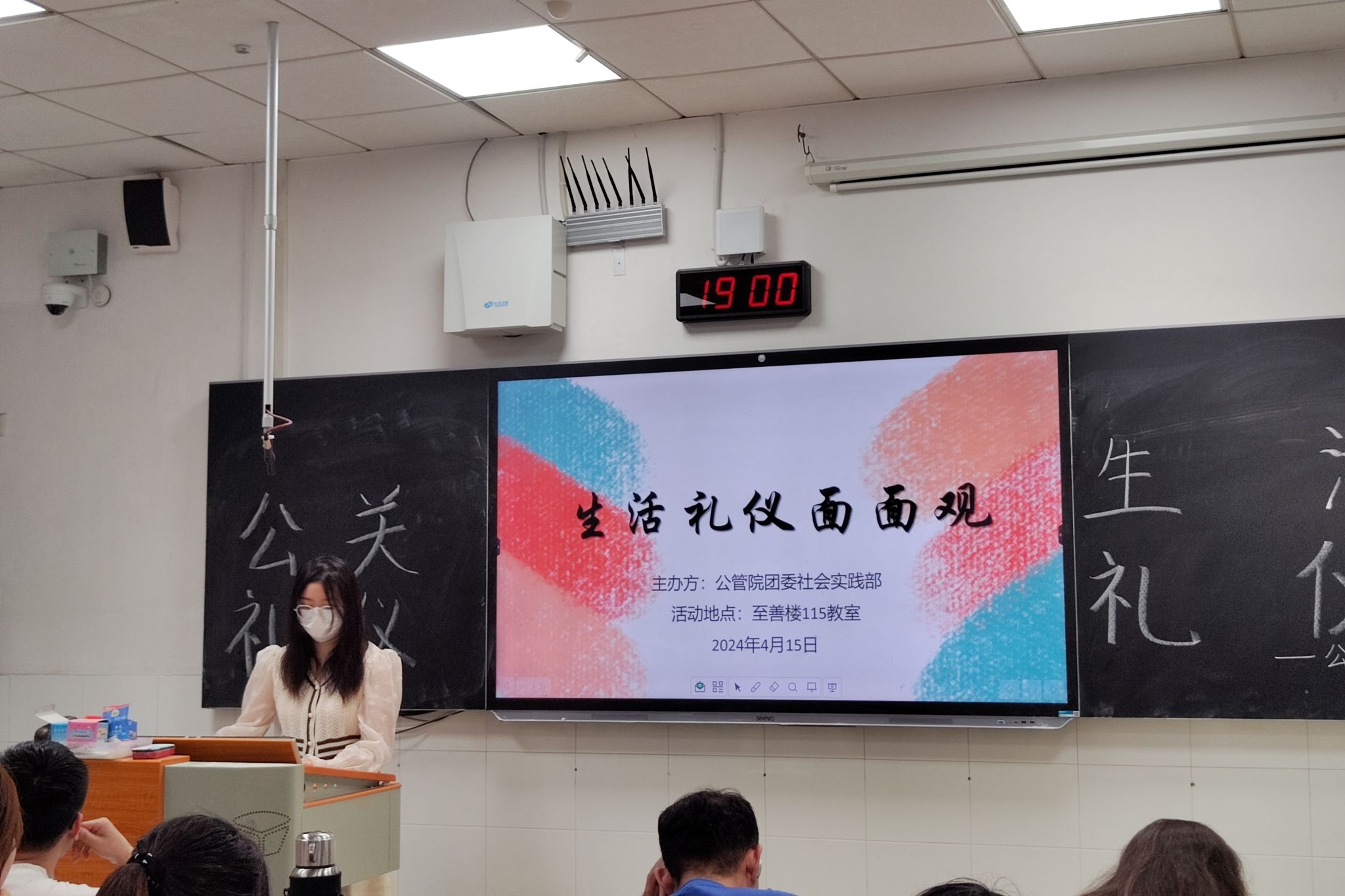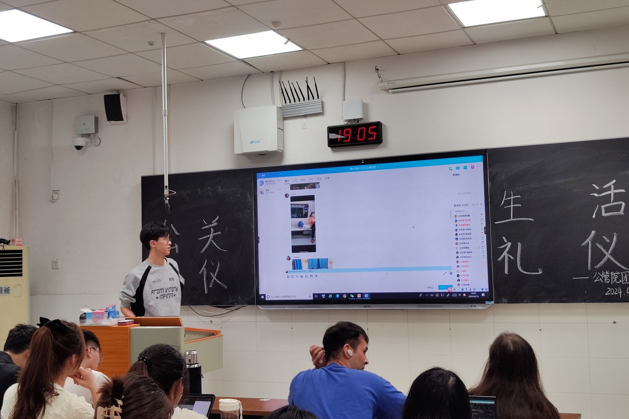 此次活动由社实部覃悦主持。活动前期,社实部成员号召同学们搜集生活中不符合礼仪规范的行为,做好充分准备。此次活动分为两个部分。第一部分展示阐述,在主持人的引导下同学们积极分享了自己在日常生活中发现的不合礼仪行为,并根据照片进行简单阐释。学员们踊跃发言,积极分享。通过展示这些不良行为,同学们更加深刻地认识到了生活礼仪的重要性。第二部分观看礼仪规范视频。通过观看视频,同学们进一步了解了礼仪规范的具体内容和实际应用。视频中展示了在不同场合下应遵循的礼仪规范,如商务场合的着装要求、用餐礼仪、握手礼仪等。同学们通过观看视频,对生活礼仪有了更全面的认识。活动最后,主持人对这次活动进行了总结点评。