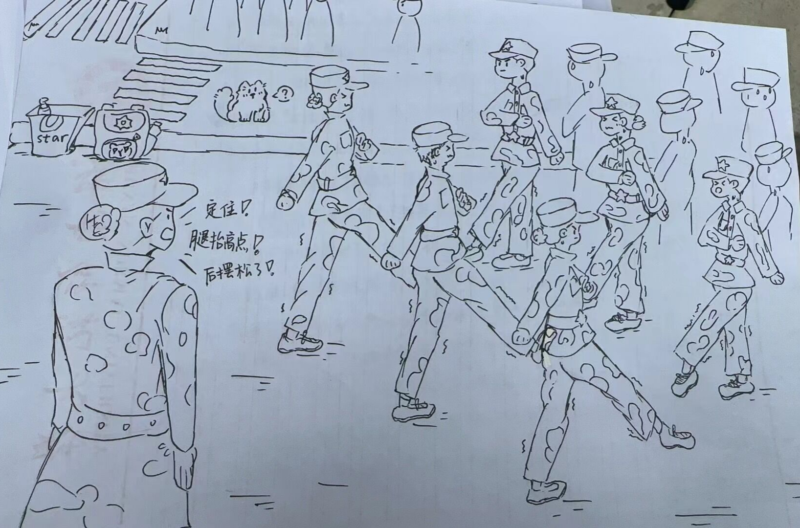 新生们用笔画勾勒出一幅幅简单而又独具特色的绘画作品,展现出军训场上的勃勃英姿。有的作品刻画了教官们笔直的站姿和坚定的目光,彰显着职责与担当;有的描绘了军助们辛勤忙碌的身影,以此表达对军助们无私关爱的感谢;还有些作品记录了军训中的欢乐趣事,如休息间隙的欢声笑语、激情澎湃的拉歌比赛场面。