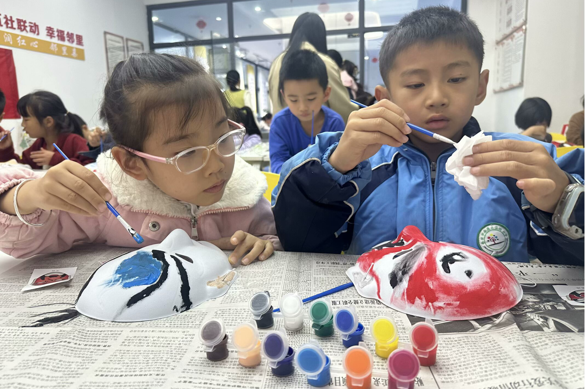 志愿服务活动期间,志愿团队与机构老师合作准备了多种授课和游戏形式,开展了“湖南民俗文化—画脸谱”和“湖南民俗文化—花灯”的特色文化素养课程,进行了“画脸谱”“制作纸杯灯笼”的美术创作游戏。志愿者们提前准备了面具、彩笔等物品,以及PPT、手工视频等资料来开展课程,“一对一”指导孩子们进行脸谱、花灯创作,并组织开展作品展示与优秀作品评选。在活动过程中孩子们主动配合,积极性较高。志愿者们对课程主讲、管理秩序、手工活动等工作进行分工合作,展现了团队精神和服务热情。