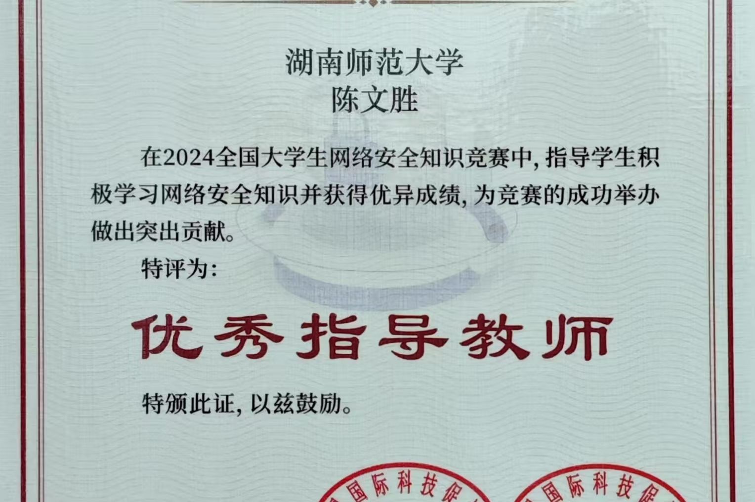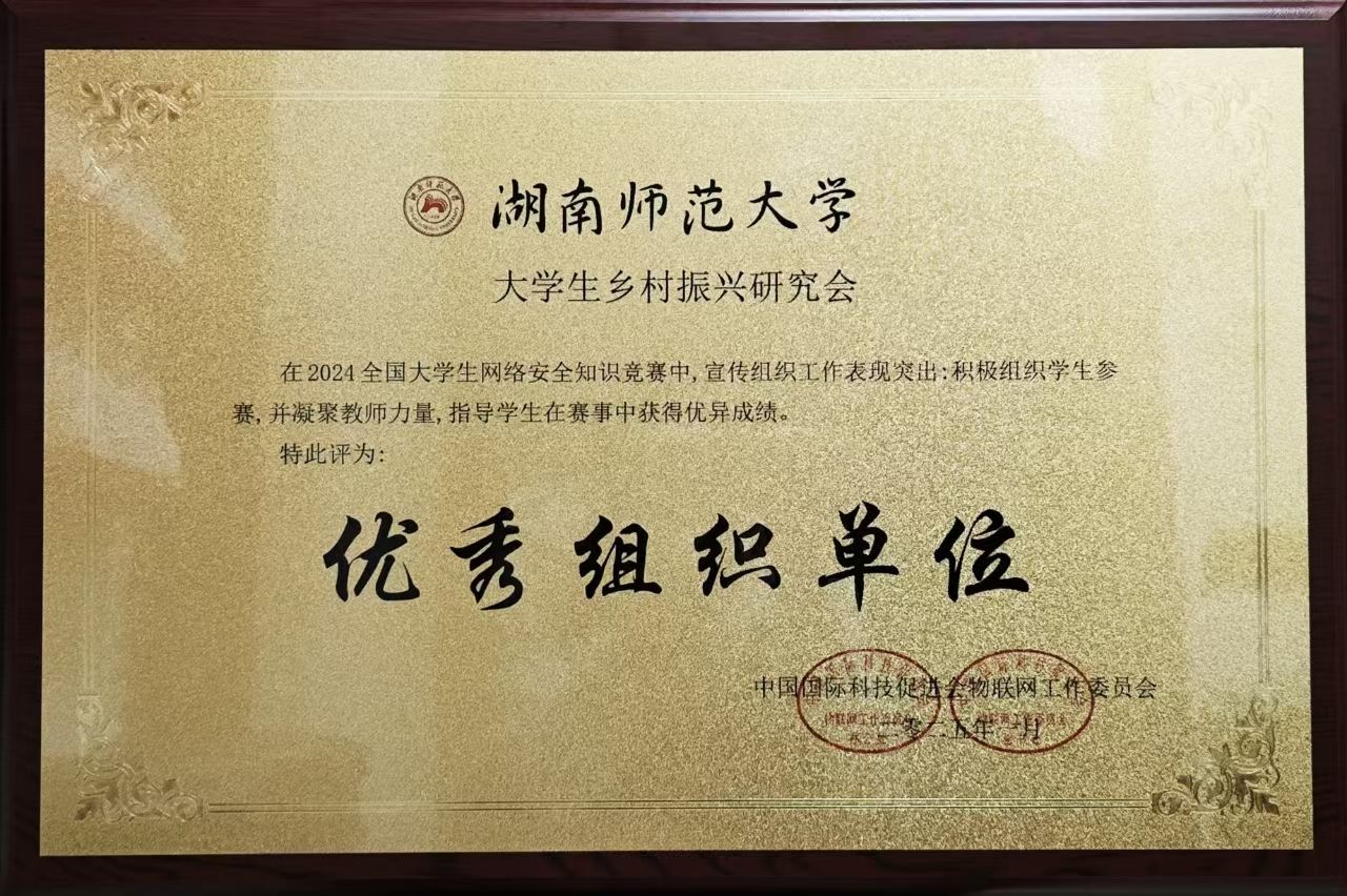 活动前期,乡研会全体成员积极筹备,制定了详细的活动方案,并与多个社团合作,进行广泛宣传动员。此外,线上交流平台搭建、宣传海报制作、活动预告发布等工作的有序进行,为活动顺利开展奠定了基础。在竞赛过程中,同学们积极参与,热情高涨。通过线上答题的形式,同学们学习了网络安全相关知识,了解了日常生活中可能面临的网络威胁,并掌握了基本的网络安全防护技能。活动结束后,乡研会理事对参赛情况进行了统计,得分高的同学获得了相应的活动证书。2025年1月,作为对乡研会工作的肯定与鼓励,此次竞赛的主办单位中国国际科技促进会物联网工作委员会分别将乡研会和教授陈文胜评为“优秀组织单位”、“优秀指导老师”,并颁发证书。