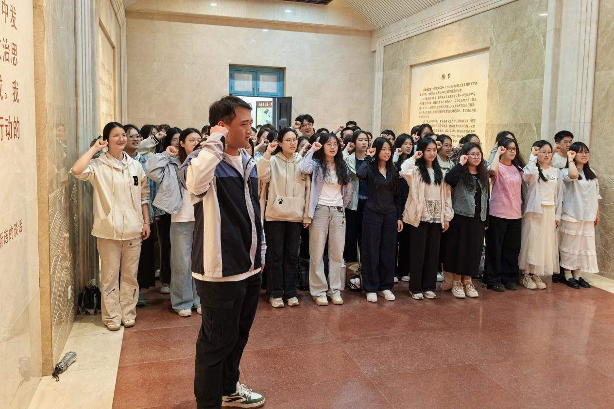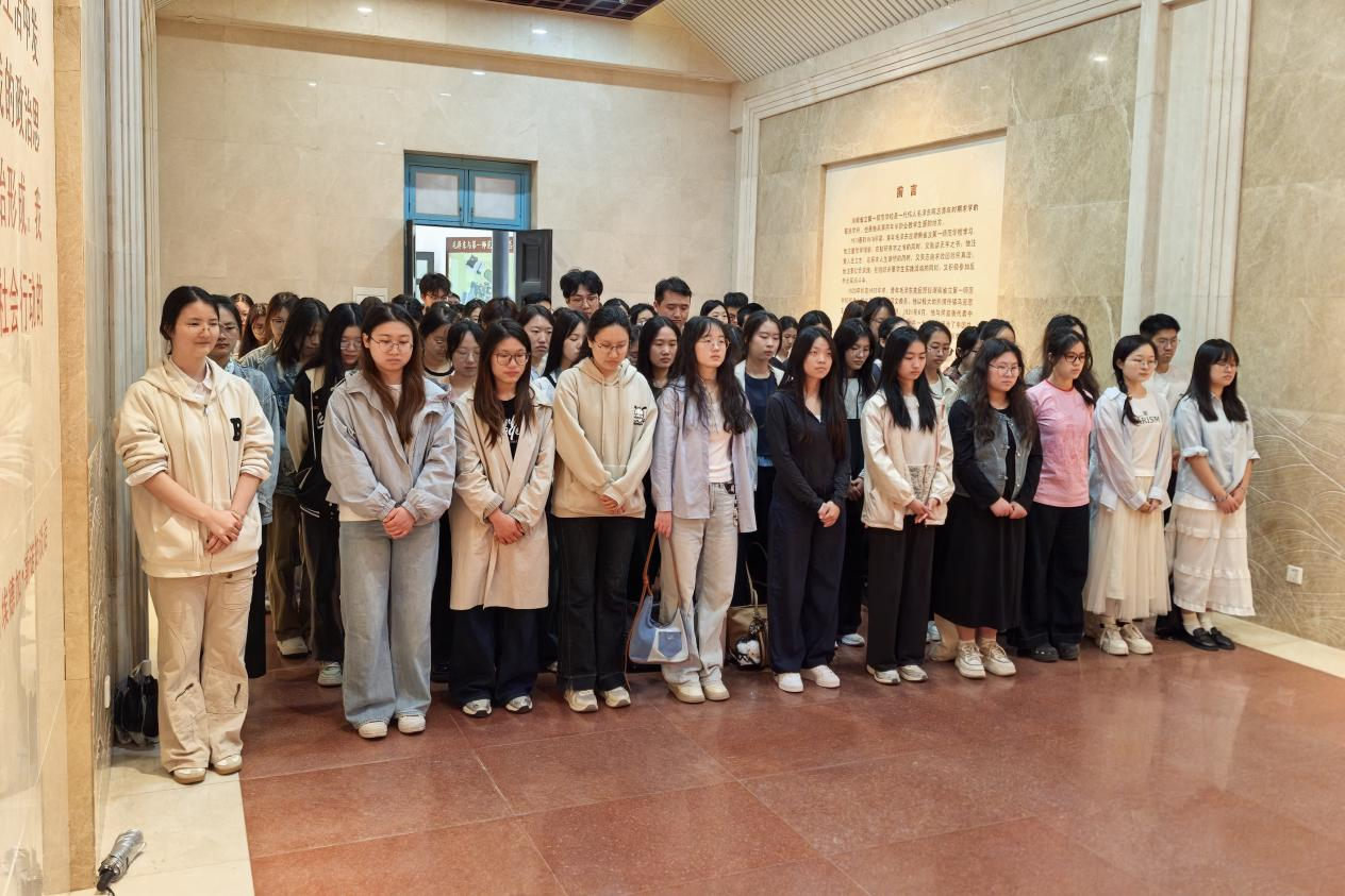 政治学与行政学党支部以及行政管理党支部成员在毛泽东与第一师范纪念馆北门集合,一同前往毛主席曾晨读过的城南书院旧址。在此处,支部成员们一起朗诵《沁园春·长沙》,从“恰同学少年,风华正茂;书生意气,挥斥方遒”中,感受毛主席当年的意气风发与理想抱负。随后,自由游览环节中,支部成员们自行探访校史馆,参观毛主席曾就读的第八班教室、寝室等原址,探寻毛主席的青春时光。最后,支部成员们回到展厅,集体学习入党誓词,并为伟人默哀一分钟。