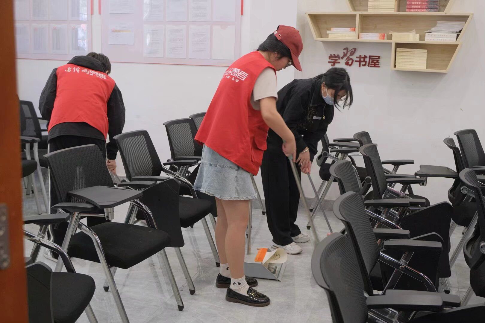 活动伊始,打扫组的同学们拿上全套工具,认真清扫社区服务中心以及周围街道,在劳动中挥洒汗水,以实际行动践行劳动精神。在与社区少年儿童的互动中,宣讲组的同学分享了清明节的由来、习俗和先烈故事。现场气氛逐渐升温,孩子们积极举手抢答,传统文化知识在寓教于乐中浸润童心。手工组的同学们引导孩子们在纸上写下对先烈的敬意、对已故亲人的思念。随后,同学们和孩子们一起折纸鸢、剪菊花。菊花承载缅怀之意,纸鸢放飞希望之羽,蕴含“继往开来,踔厉奋发”的精神。