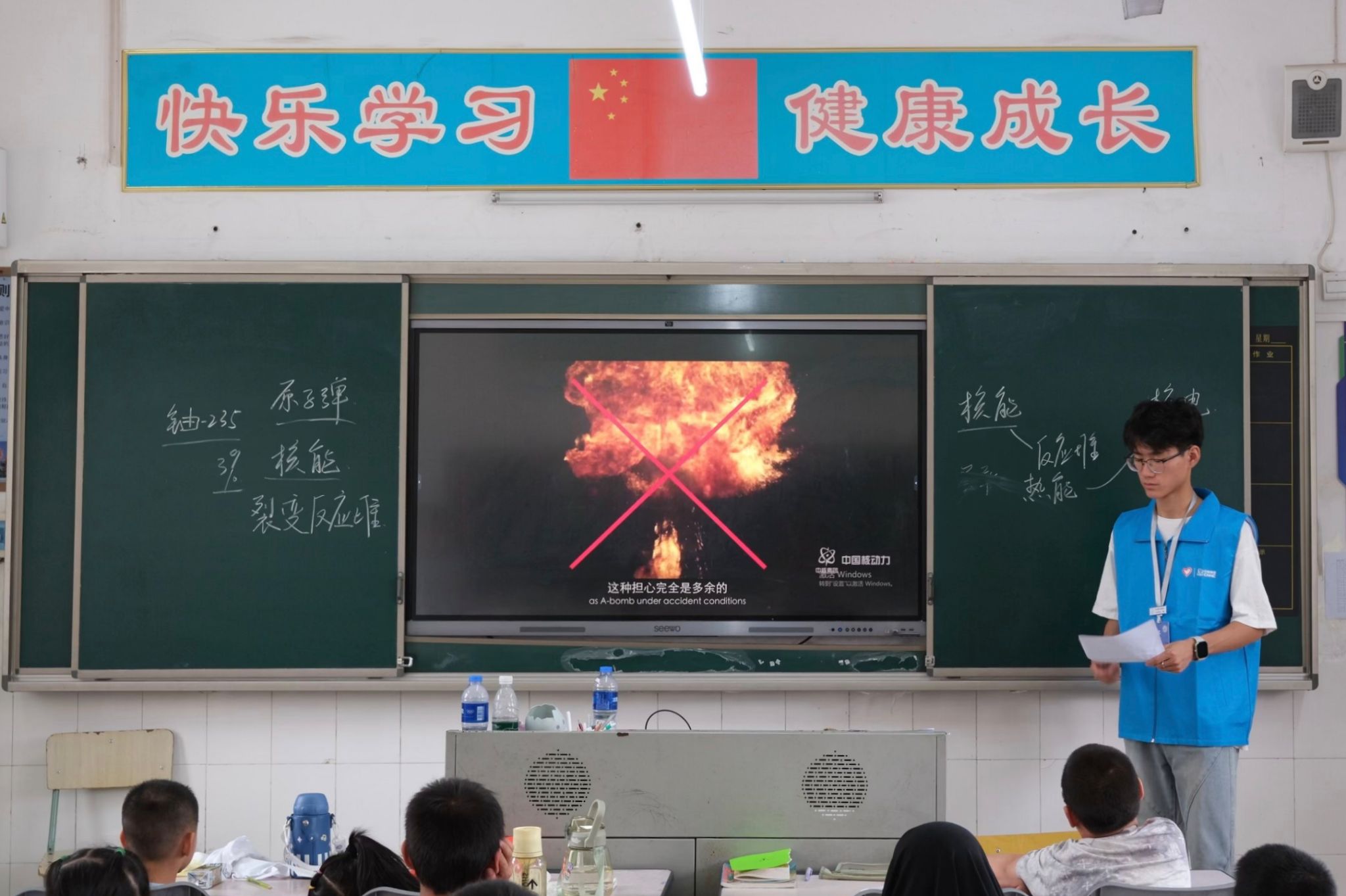 “探秘核电站”活动中,实践团成员以童趣化的方式揭开核电站的神秘面纱,并通过核电与火电的对比,让同学们了解核电清洁高效、供应稳定等优势,以此激发同学们对能源科技的好奇心与探索欲;“从平江起义到两弹一星”活动中,实践团成员从平江起义精神出发,引导同学们理解革命文化与社会主义先进文化的传承关系,让红色基因在青少年心中扎根;“铀的三生三世”活动中,实践团成员以科学家曲折探索的故事开篇,进而讲解铀元素知识,同时介绍铀的发现、开采及其在核能利用领域的作用,帮助同学们树立“崇尚科学、探索未知”的信念。