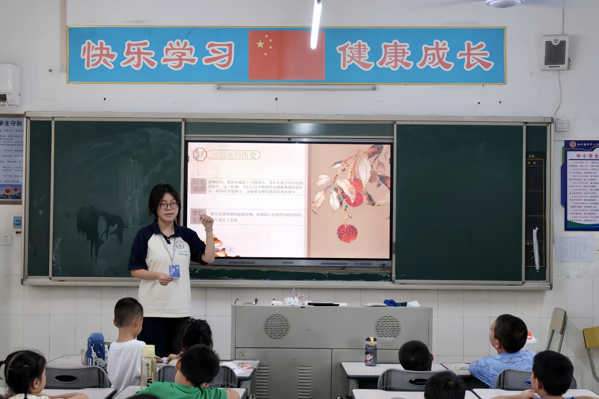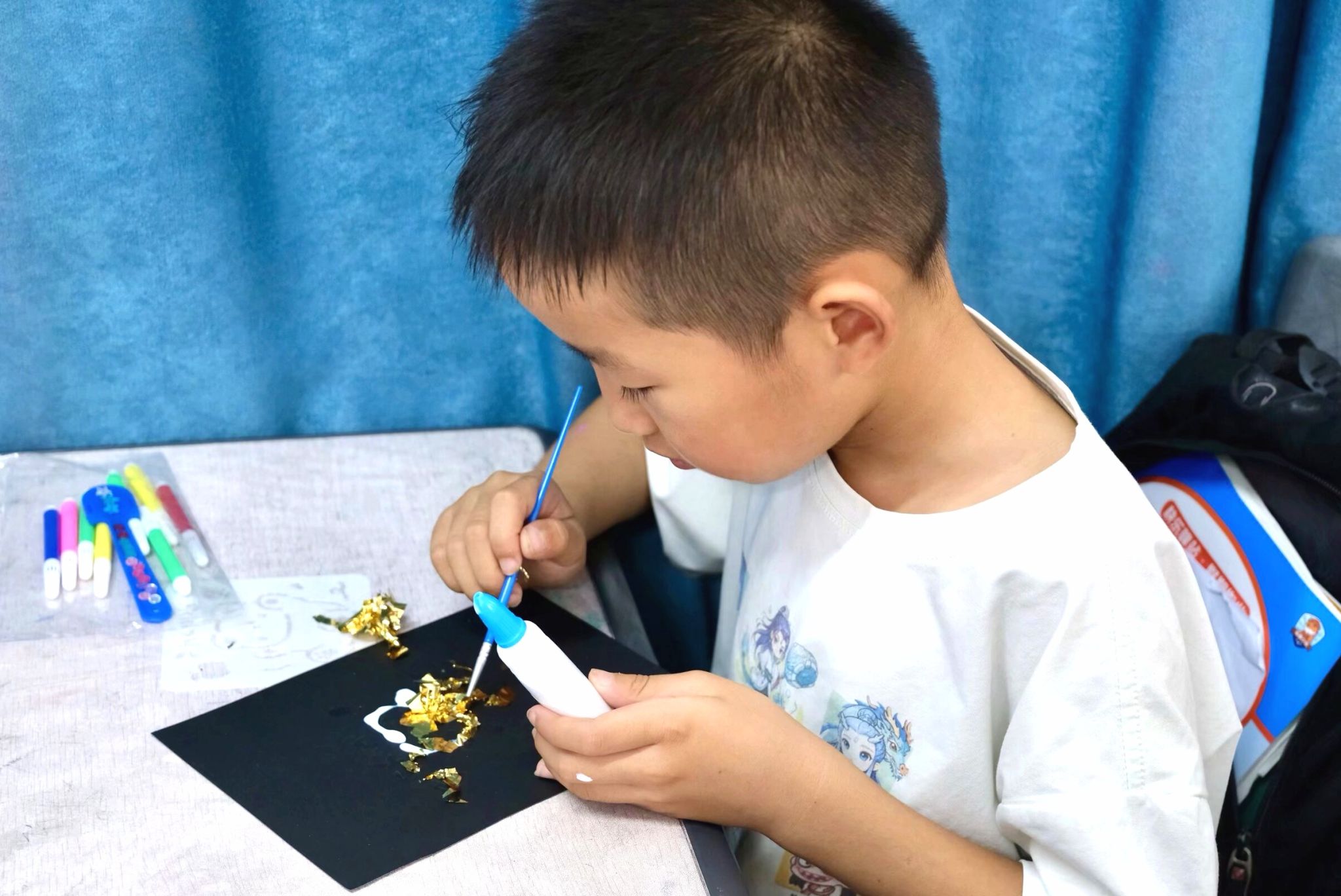 “非遗脸谱”课程中,实践团成员结合经典戏曲角色,阐释了脸谱“红表忠义、白显奸诈”等色彩象征意义,并现场示范“勾、填、涂”等勾画技巧。随后,同学们利用颜料、画笔及脸谱轮廓模板,自由搭配色彩、勾勒线条,完成个性化脸谱创作。“非遗烧箔画”课程则通过成品展示,让同学们直观感受其艺术魅力。在实践团成员讲授箔纸剪裁、定位拼贴及低温灼烧塑形等关键步骤后,同学们动手实践,用箔纸拼贴基础图形,灼烧出明暗纹理,最终形成独特图案。