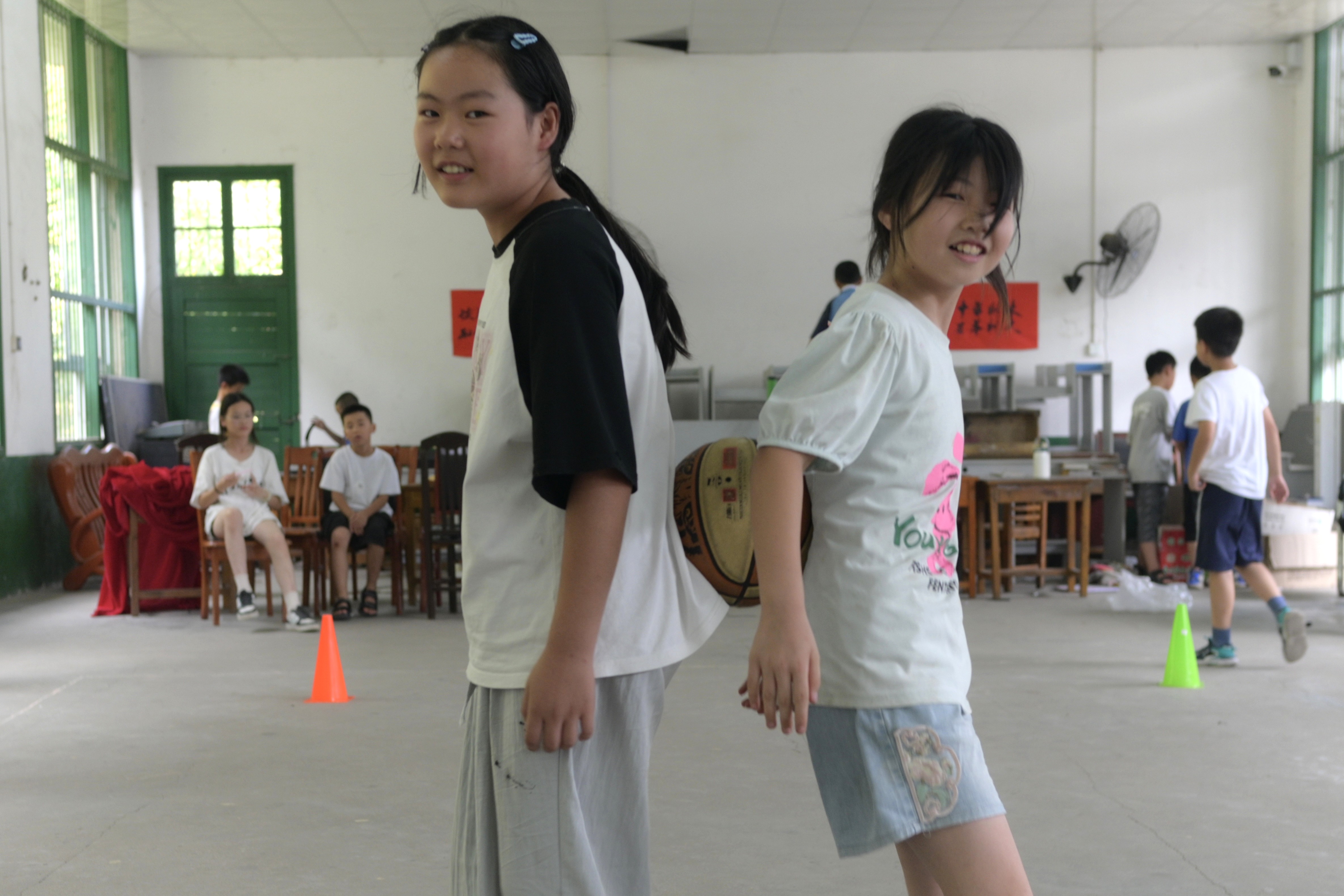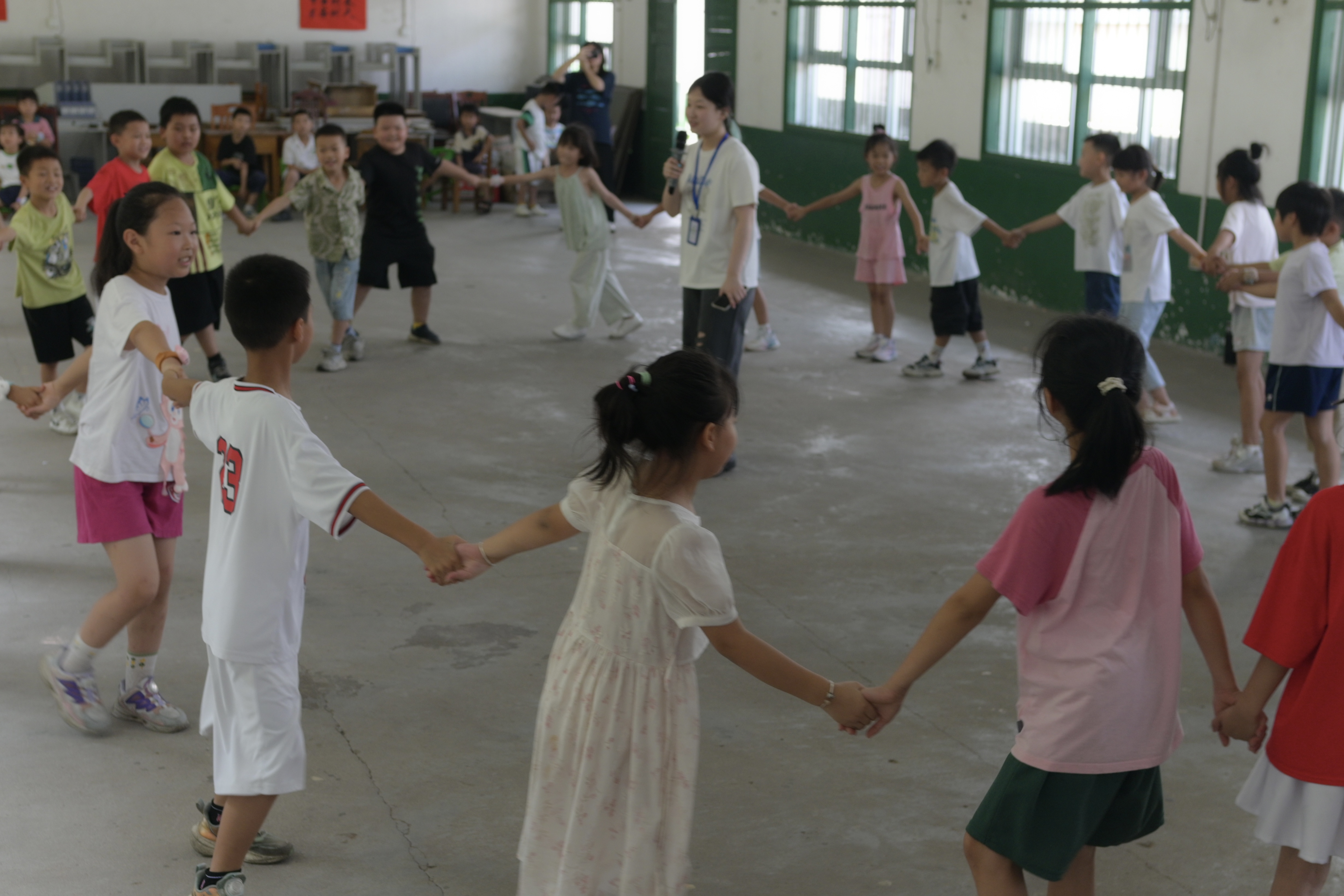 上午场中,小班与中小班的学生托举实心球穿梭接力,他们在"爱的抱抱"里敏捷计算拥抱人数,"萝卜蹲"考验着反应与默契。下午赛事升级,中大班与大班的学生背靠背运球传递信任, 在"小青蛙跳荷叶"巧用纸板跨越"池塘"。此过程中实践团成员全程引导,确保安全与秩序并行。