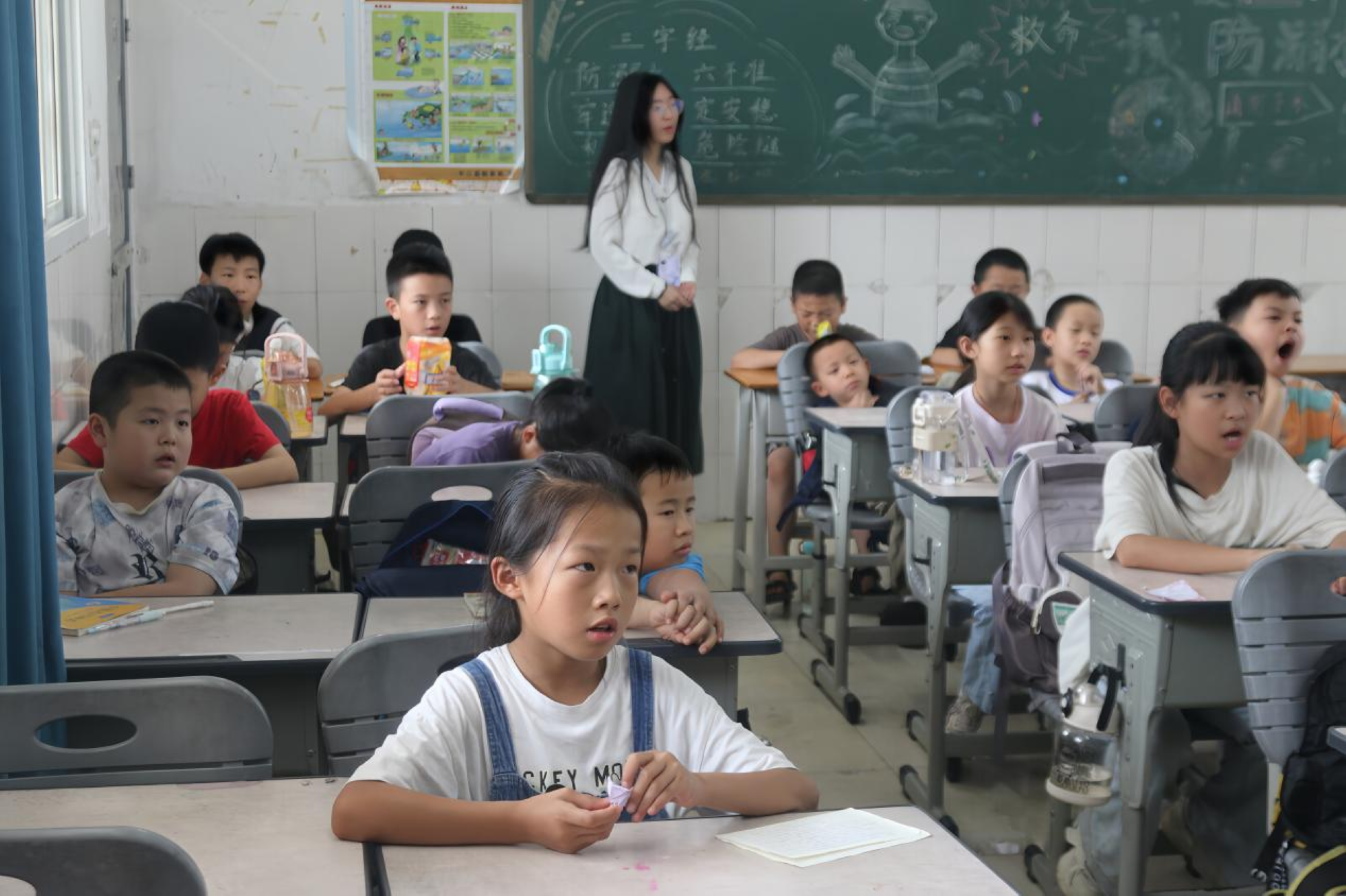 在“认识民族服饰”活动中,实践团成员展示苗族银饰、蒙古族长袍等服饰,结合图文讲解服饰纹样中的民族历史与生活智慧,同学们通过观察图腾、品味刺绣,直观感受“衣冠上国”的文化底蕴。“民俗文化课”以故事叙述形式展开,从傣族泼水节的祈福寓意到维吾尔族古尔邦节的团圆内涵,让同学们对各民族习俗形成初步认知。“彝族歌曲教学”活动中,实践团成员则用吉他伴奏教唱《不要怕》,同学们跟着旋律学唱,亲身体验了彝族音乐特有的节奏特点和情感表达,体会到了彝族人民面对困难时乐观坚韧的精神。