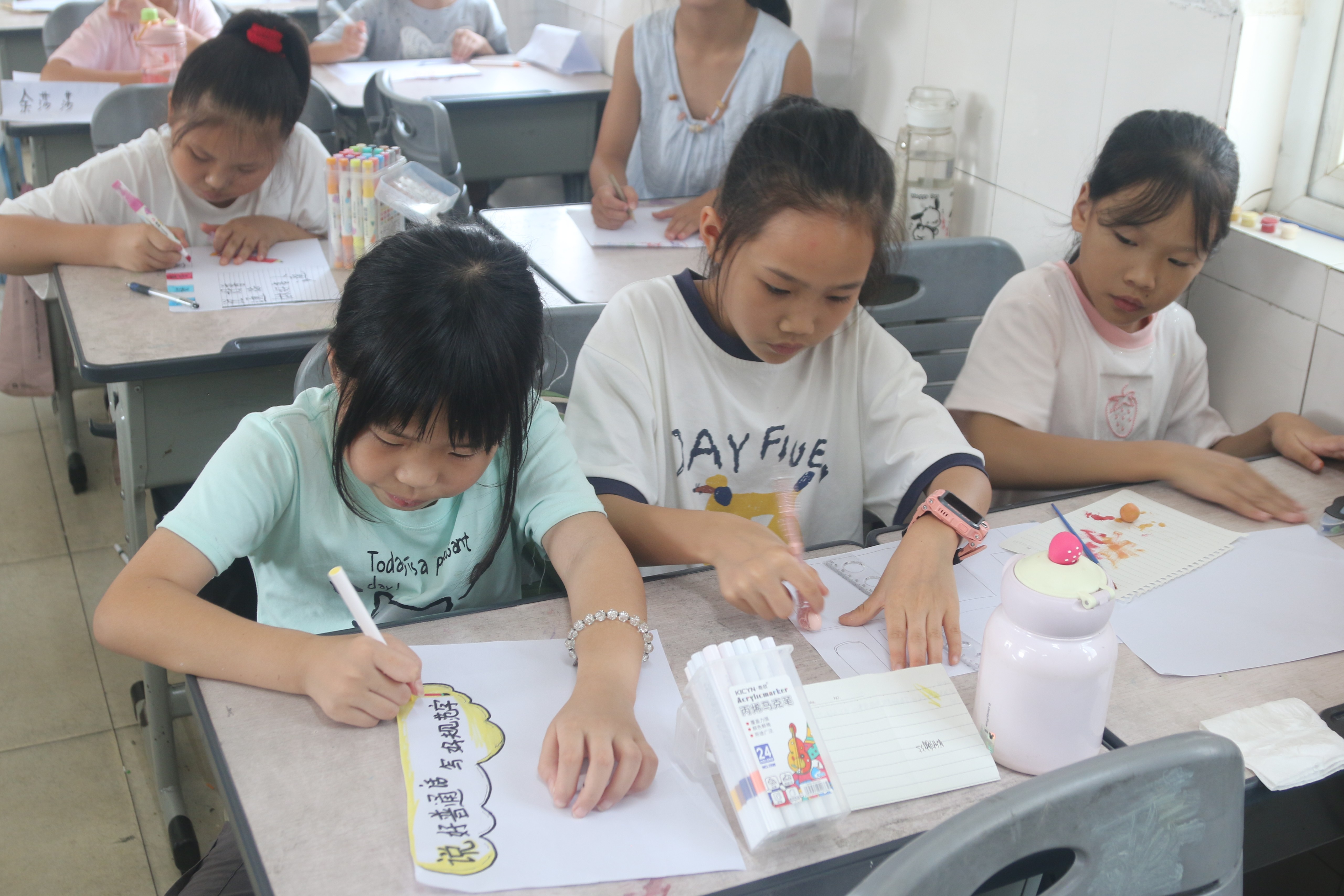 在一系列课程结束后,实践团成员带领他们回顾前期所学习的语文和汉字知识,明确了“说好普通话,写好规范字”的中心思想。同时,组织学生发挥想象力与创造力,综合运用标准汉字书写及普通话推广标语,进行普通话主题手抄报的绘制。
