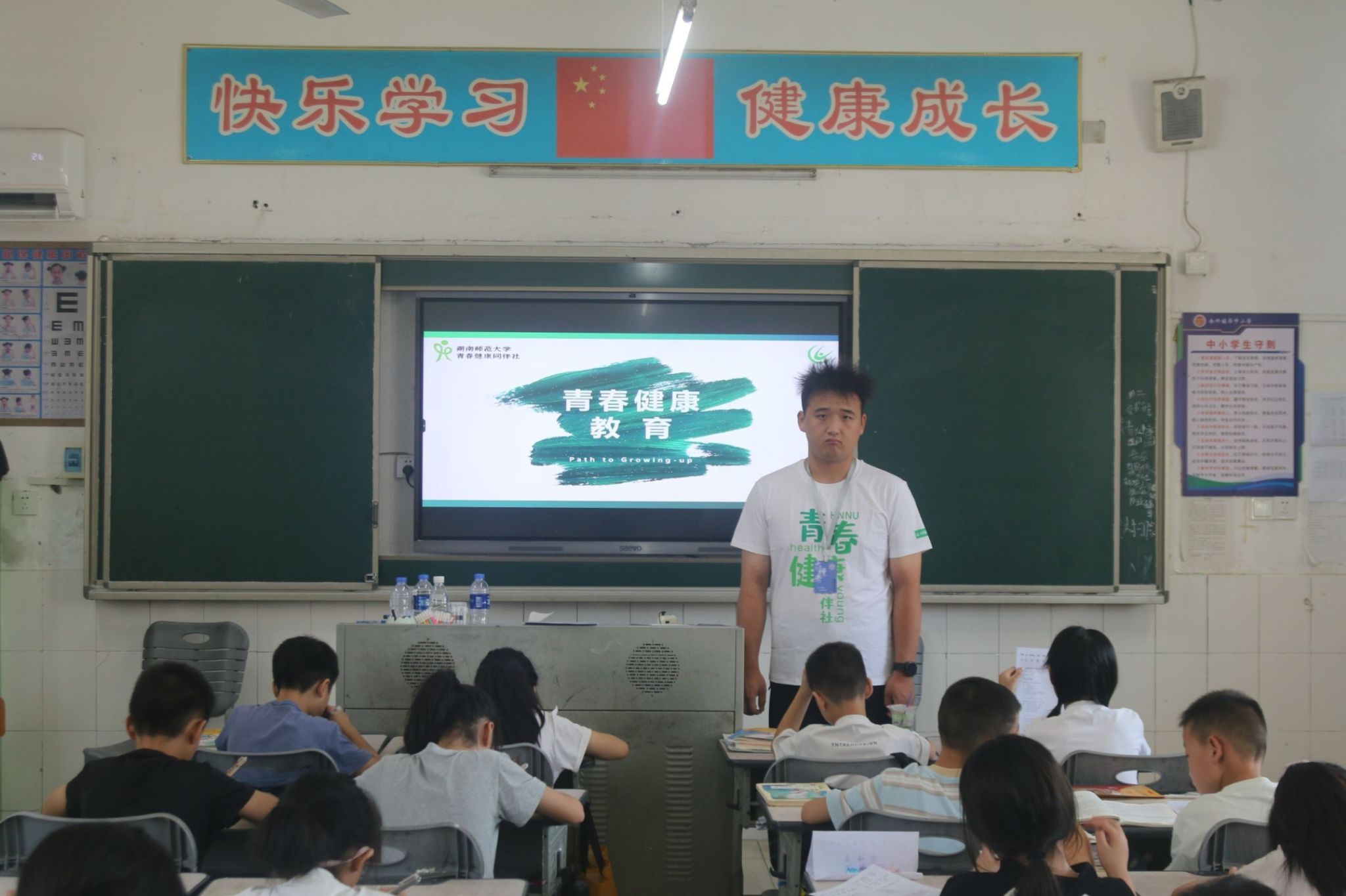 在“青春健康,护航花季”性教育专题活动中,实践团成员播放性教育主题动画短片,并通过发放问卷了解学生安全认知现状。随后,实践团成员用“身体是一座小房子,有些房间不欢迎客人”的比喻讲解隐私部位,通过情景对比帮助建立行为界限。