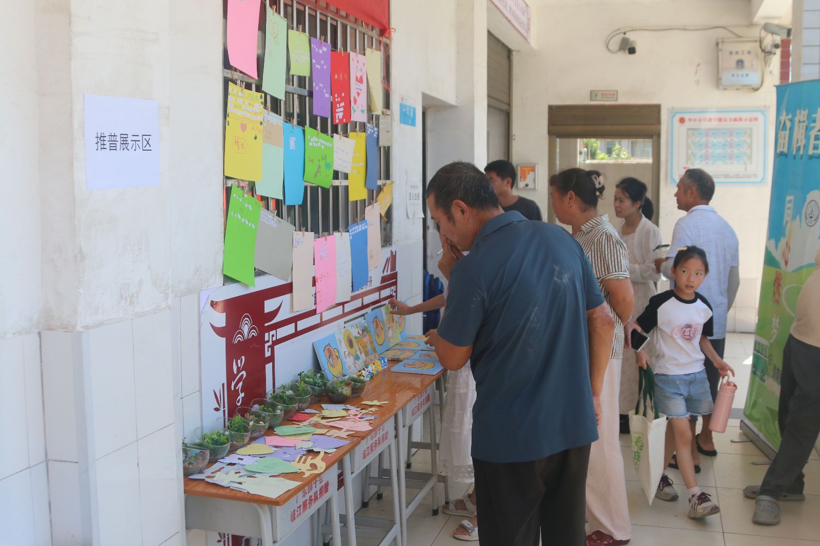 仪式前期,实践团成员提前完成教室内外的布置,在教室内摆放奖品、布置黑板,在教室外的走廊上设四个专题展区。其中,推普展区陈列孩子们的推普成果手抄报,“两弹一星”展区展示孩子们在专题活动中的学习心得与绘画作品,非遗展区摆放孩子们参与非遗系列特色活动的手工作品,手工展区则汇集孩子们在各种手工活动中的实践成果,各类作品有序陈列,形成系统的成果展示区域。