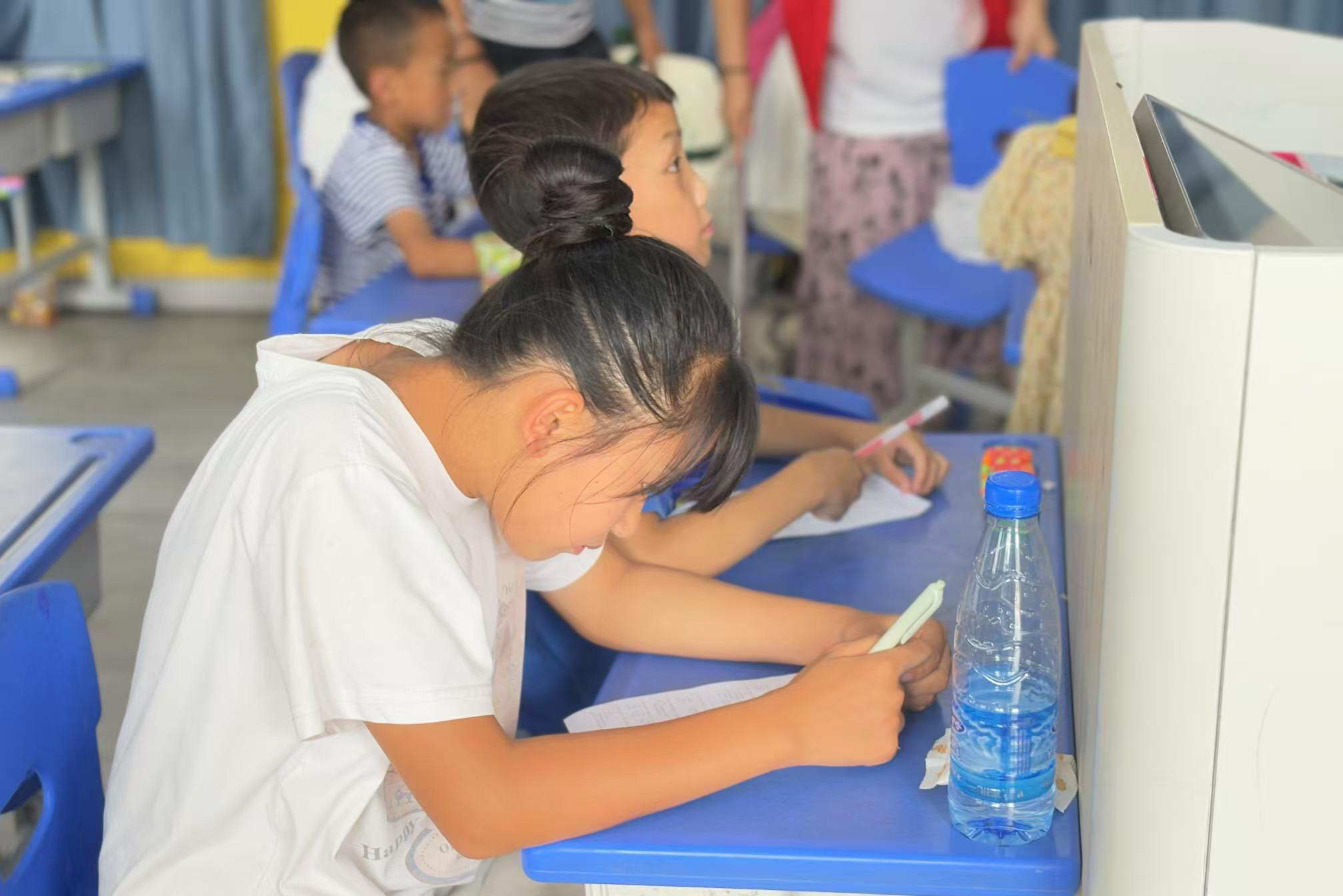 队长曹泽雨开场发言。他代表实践团向排碧学校、当地教师以及参与活动的学生表达了谢意,并对过去一段时间的支教调研工作进行了简要回顾。随后,活动进入学生心声表达环节。孩子们在信纸上写下这段学习生活的感悟,在黑板上留下对教学组成员的祝福。