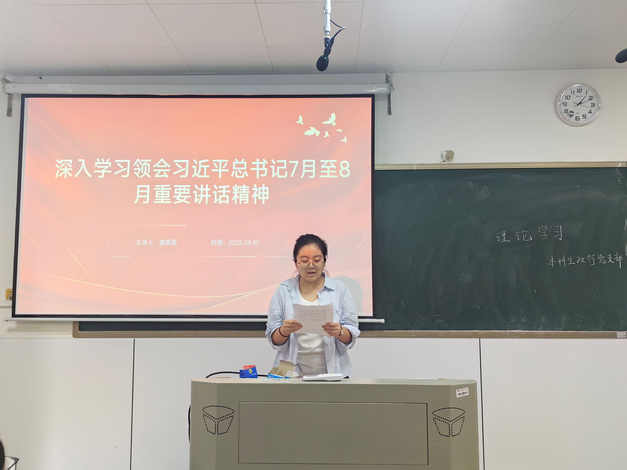 (通讯员 王文桐 樊星 谭欣雨)为深入贯彻学习习近平总书记7月至8月重要讲话精神,增强党支部成员们的政治自觉和责任担当,9月10日中午,本科生政治学与行政学党支部(以下简称“政行党支部”)于景德楼中栋112教室开展以“深入学习习近平总书记7月至8月重要讲话精神”为主题的九月理论学习活动。谢思雨担任活动主讲人,政行党支部全体成员参加。