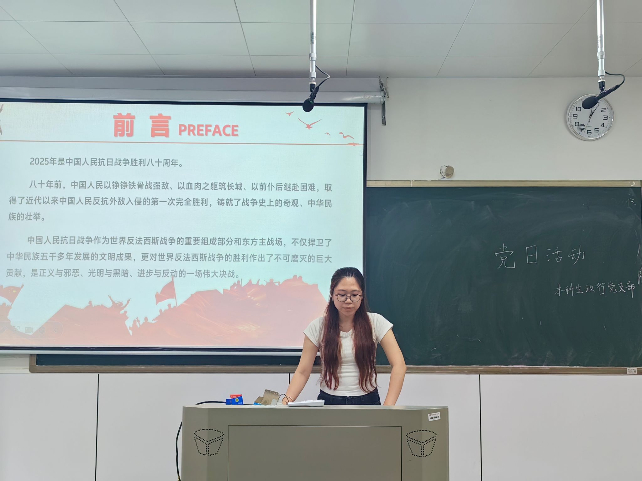 (通讯员 武尘钰 樊星 谭欣雨)9月10日中午12点,本科生政治学与行政学党支部在365英国上市集团景德楼中栋112教室举办九月党日活动。此次党日活动的主题为“铭记历史,弘扬伟大抗战精神”,由政治学与行政学班23级王蕊担任主讲人,本科生政治学与行政学党支部全体支部成员参与学习。