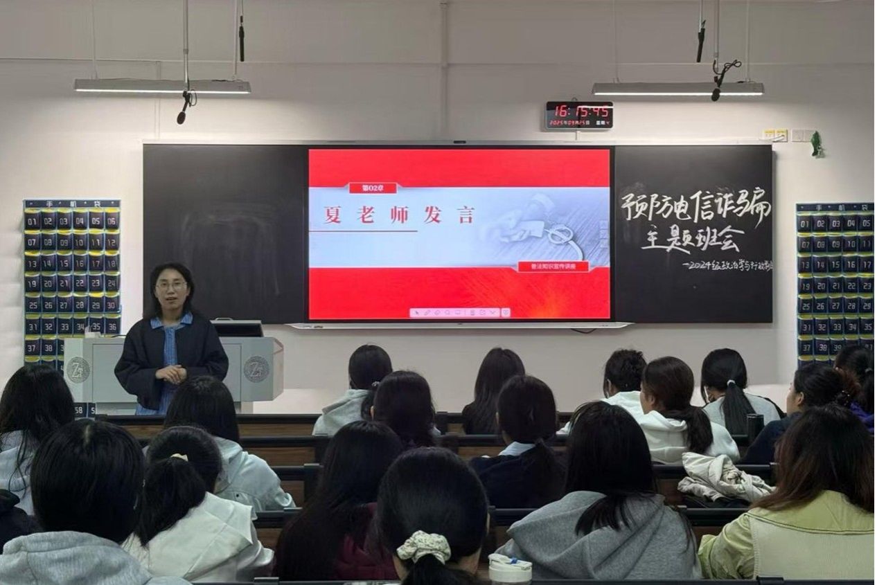 留晨涵结合当前电信诈骗的高发态势,对电信诈骗的常见类型进行了简单介绍。随后,班会组织全体同学集中观看了由公安部刑侦局制作的《一堂反诈课》宣传片,影片通过真实案例还原、诈骗手段拆解、防范技巧讲解等内容,展现了电信诈骗的隐蔽性与危害性,让同学们感受到诈骗分子的常用套路。辅导员夏瑞霞对班会内容进行总结,并结合真实案例,强调没有天上掉馅饼的好事,以此警示同学们时刻紧绷反诈之弦,切勿抱有侥幸心理。