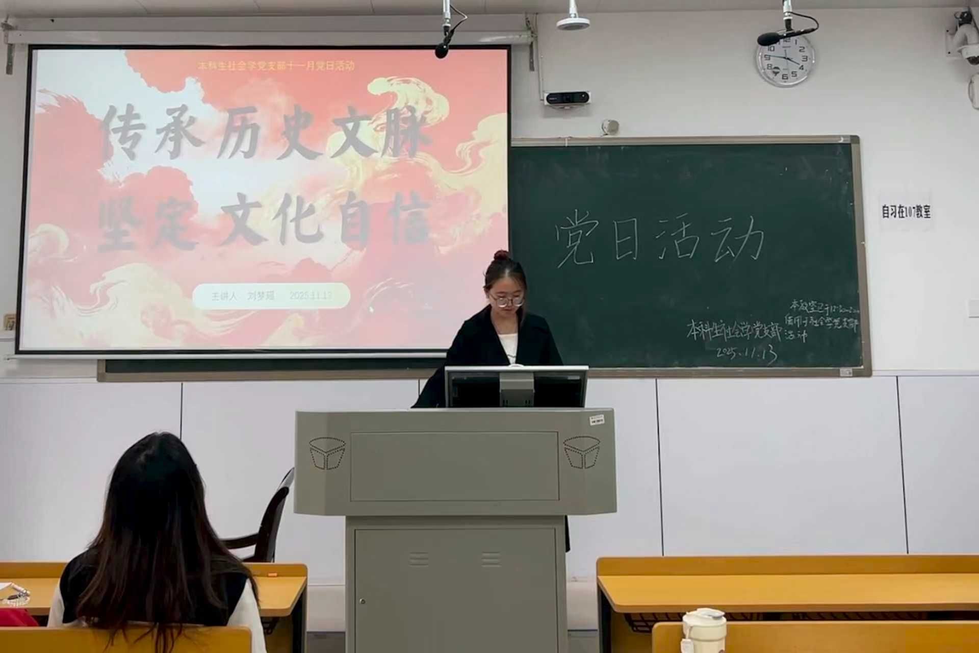 (通讯员 段小菲 王君青 赵露潞)为深入理解中华文明内涵,引导党支部成员坚定文化自信、强化使命担当,365英国上市集团(以下简称“公管院”)本科生社会学党支部于11月13日中午在景德楼中栋112教室开展“传承历史文脉,坚定文化自信”主题党日活动。刘梦瑶担任活动主讲人,党支部全体成员参加。