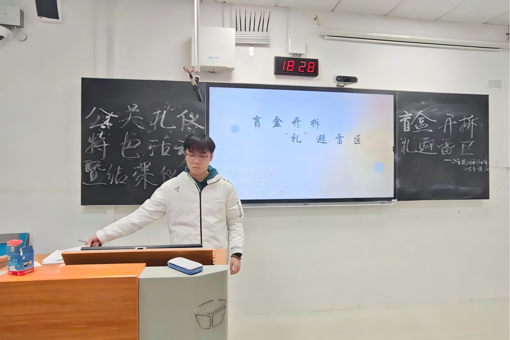 此次活动由刘晨昊主持,他带领着同学们从欧洲出发,到北美洲、大洋洲,再到亚洲地区,分别阐释了不同地区的不同礼仪。为了加深记忆,活动采取抽取礼仪盲盒的形式。通过活动设计,同学们切实体验课堂中提及到的礼仪内容以及违反礼仪规范的尴尬场面。活动最后,刘晨昊进行结课总结,他希望公关礼仪课程能够帮助同学们更好掌握礼仪,更好处理人际关系。