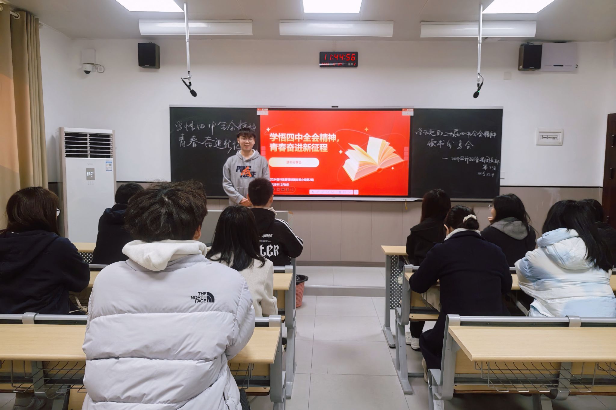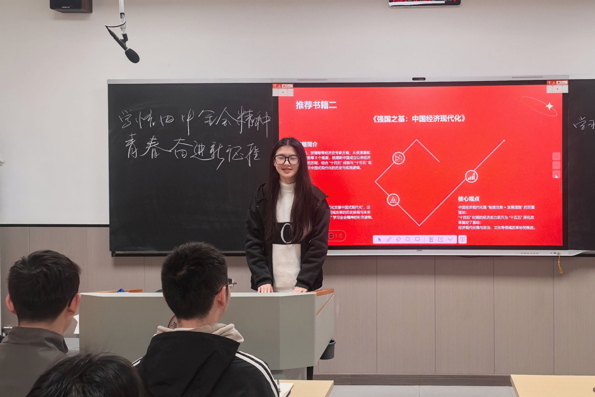 分享会由小组组长刘晨昊主持。他首先围绕党的二十届四中全会的召开背景、重大成就、战略部署及深远意义进行了系统阐述,引导同学们深刻领会全会在国家发展关键阶段的指导作用。随后,陈珏嵘、王亚妮思、彭伊顺三位同学依次分享了《党的二十届四中全会〈建议〉学习辅导百问》《强国之基:中国经济现代化》《习近平谈治国理政(第五卷)》等书目的学习心得,并结合全会精神进行了深入探讨。在交流环节中,同学们聚焦改革部署、中国式现代化的核心内涵以及青年一代的使命担当等议题,展开了热烈讨论。