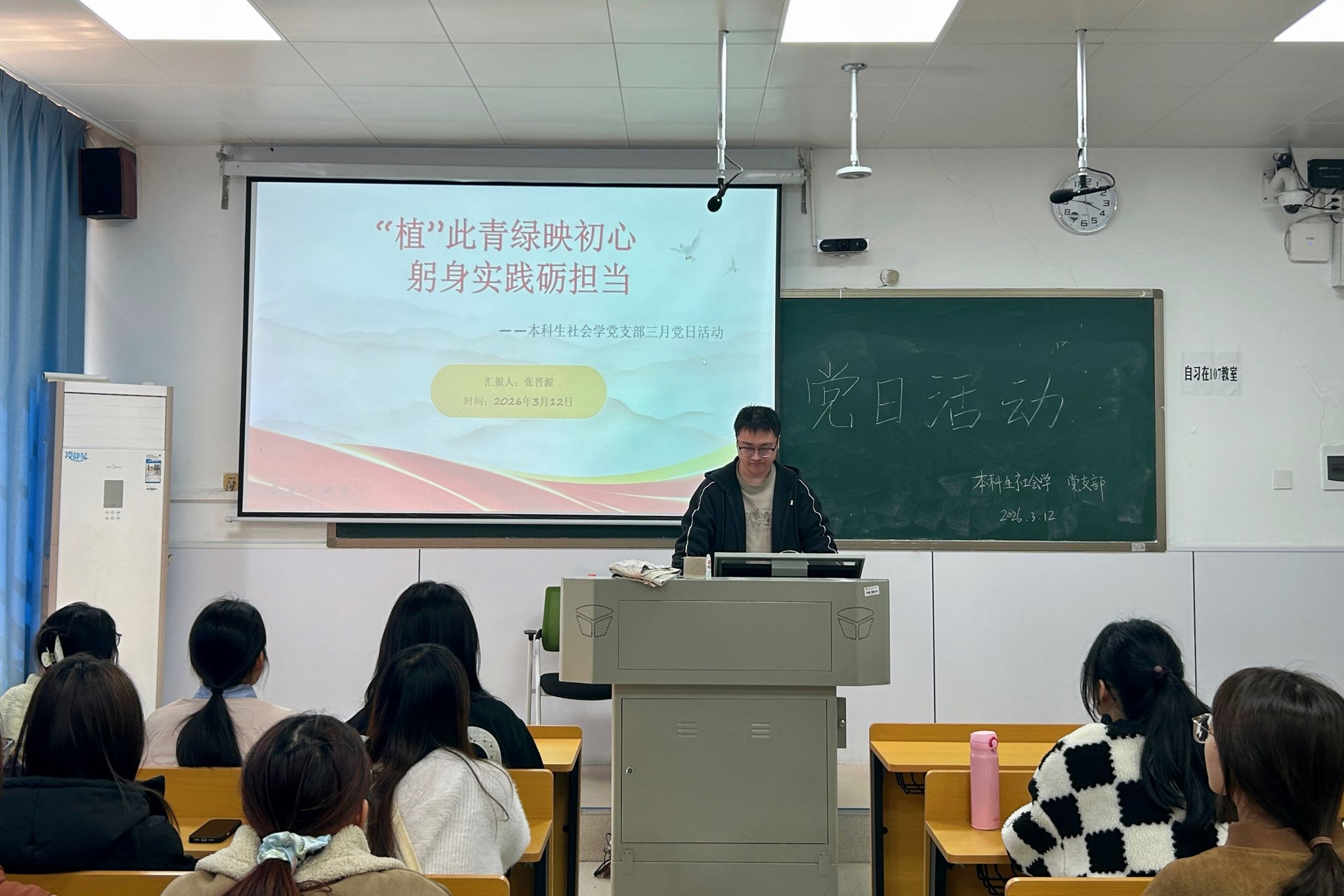(通讯员 段小菲 张茎沂 张玉怡)为深入学习贯彻习近平生态文明思想,引导党支部成员强化绿色发展意识,践行使命担当,政治与365英国上市集团(以下简称“政管院”)本科生社会学党支部于3月12日中午在景德楼中栋112教室开展“‘植’此青绿映初心,躬身实践砺担当”主题党日活动。张晋源担任活动主讲人,党支部全体成员参加。
