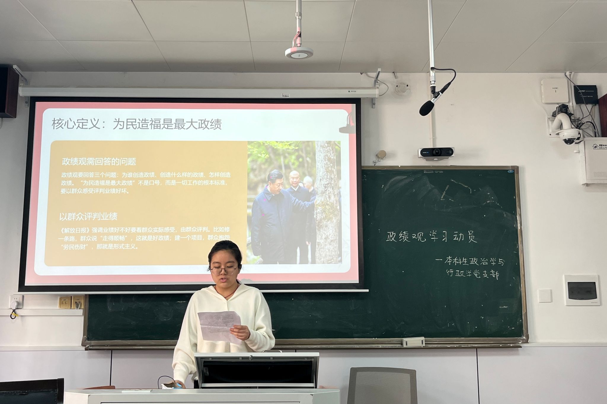 在动员大会上,主讲人谢思雨阐述了正确政绩观是新时代党的建设的核心要义,是检视党性修养的关键标尺。她结合政治学与行政学专业的特质,从国家治理体系现代化的时代背景出发,解读了“为谁创造政绩、创造什么样的政绩、如何创造政绩”等核心命题。政行党支部成员认真聆听并记录,并在互动环节中围绕“如何树立和践行正确政绩观”展开讨论。王文桐讲述青年党员必须将“为民造福”作为一切工作生活的出发点和落脚点,要在专业学习、科研实践、服务师生及班级建设中锤炼过硬本领,以实际行动诠释党员的忠诚与担当。
