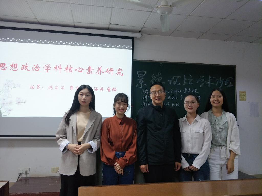 第30期学术沙龙活动以“思想政治学科核心素养探究”为主题,主讲人为陈芊芊、李宗兰、吴海英、唐静四位同学,并邀请了蒋国海老师前来指导。四位主讲人分别阐述了素质、素质教育、三维目标和素养、核心素养、学科核心素养等基本概念。蒋老师认为在探讨思想政治核心素养这个主题时,发言人应具体举出实例来论证核心素养在教材和课程中的体现。蒋老师建议同学们可从核心素养落实中存在的问题?为什么会出现这样的问题?对现代社会有什么影响等方面进行深入分析。