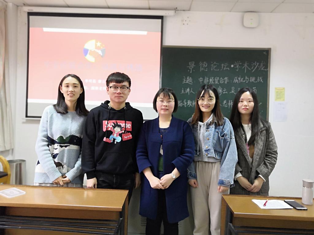 (通讯员:李明磊 陈雅倩)2019年4月15日下午13:30,我院于公管楼311教室举办了2018级第13期“景德论坛·学术沙龙”活动。本次学术活动以“中非经贸合作:成就与挑战”为主题,来自政治学专业的李明磊、廖云、吴玉、杨芮四名同学为本次活动的主讲人,并邀请颜琳老师为指导教师,肖丽娟同学担任主持人。