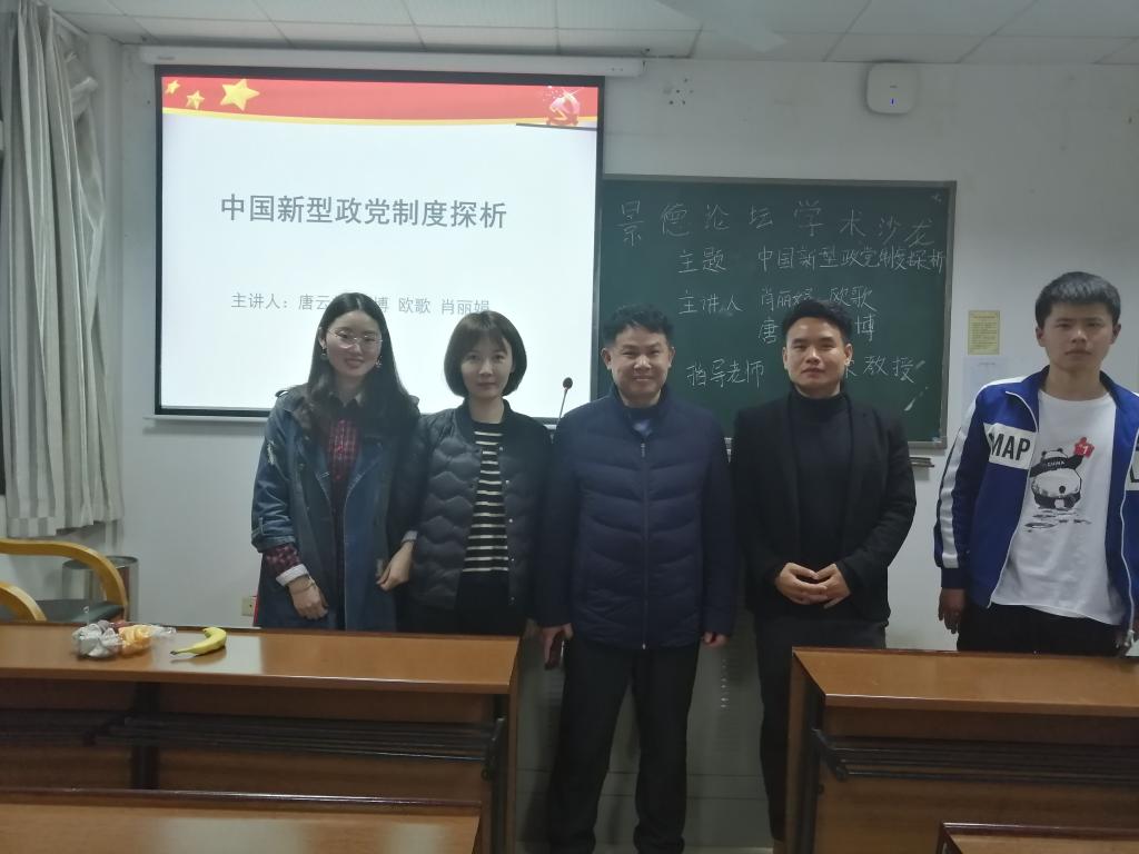 (通讯稿:欧歌陈雅倩)2019年4月4日晚18:30,我院于公管楼311教室举办了2018级第9期“景德论坛·学术沙龙”。本次活动以“中国新型政党制度探析”为主题,来自政治学专业的唐云帆、谭博、欧歌、肖丽娟四位同学为本次活动的主讲人,陶云飞同学为主持人,并邀请了政治学系肖光荣老师前来指导。
