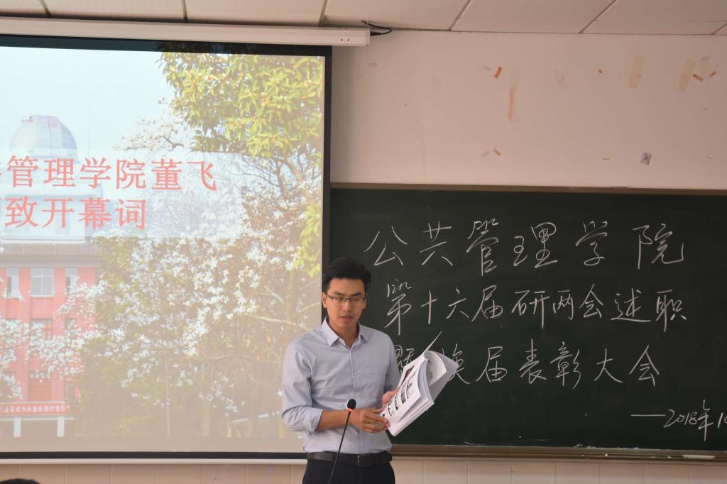 会议在庄严的国歌声中拉开序幕,董飞老师致开幕词,他回顾了研两会过去一年的工作,高度肯定了第16届研两会全体学生干部的工作能力和工作态度,并寄语研两会留任干部和新加入成员继续秉承乐善好施的研会人精神,着力创新工作方式,打造高品质的研究生文化,探索研两会内涵式发展的道路,为学院的发展做出更多贡献。