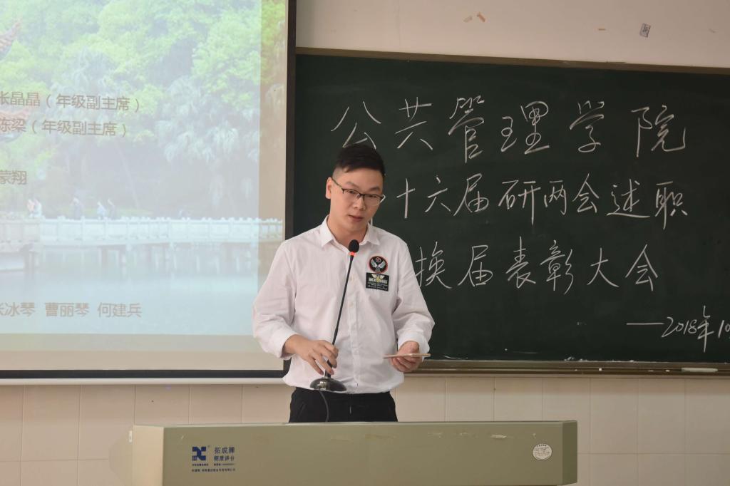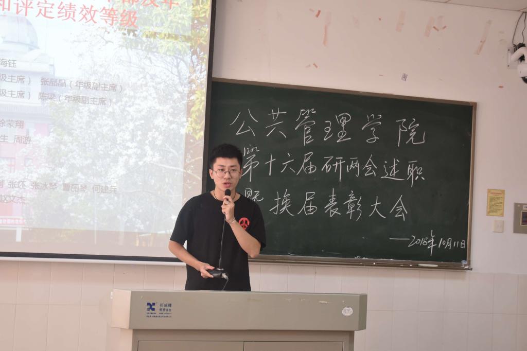 会议第三项,第16届研两会全体干部进行述职。第16届研究生会主席陈强和研团总支书记刘凤玲率先进行工作报告,他们高度称赞了研两会全体干部的工作态度,感谢大家对工作的支持,并寄望下一届研两会成员踏实做人、认真做事。随后第16届研两会学生干部依次进行了述职发言。