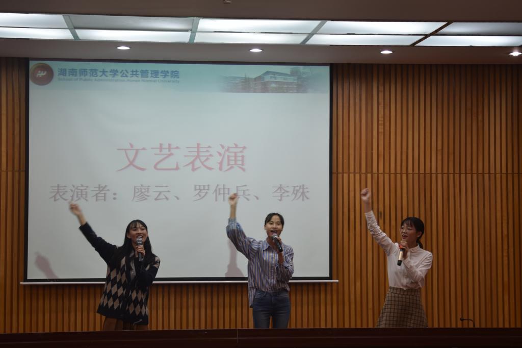 随后,2018级研究生李殊、罗仲兵、廖云三位同学为大家倾情演唱了一首《我曾是少年》,赢得了同学们热烈的掌声和欢呼声,现场气氛从紧张变的活跃轻松。此外,哲学专业的王瑶同学与远道而来的湖南农大本科生杨彦达合作,为大家带来了一段精彩绝伦的相声表演——《礼仪漫谈》。二人用滑稽搞怪的神情,大胆夸张的肢体语言以及幽默的话语,为大家演绎了世界各地不同的见面礼仪,赢得了同学们的阵阵欢笑。