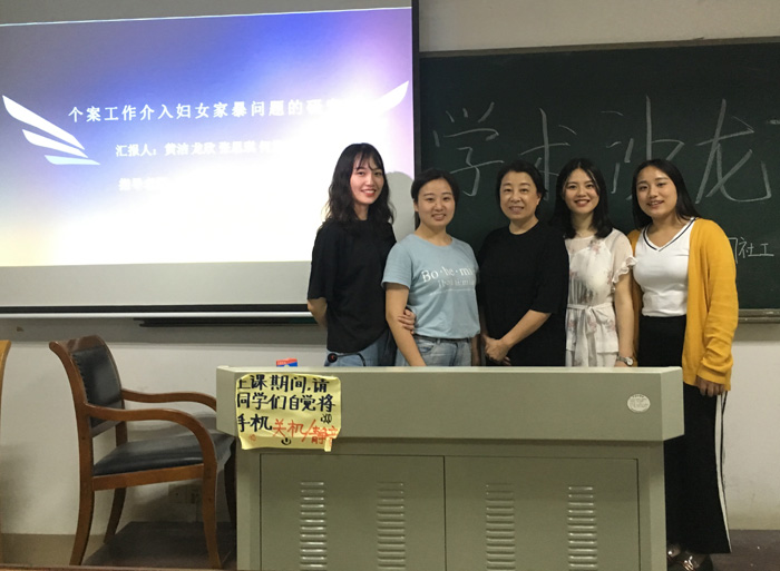 (通讯员 李娜)2018年5月12日晚,我院2017级社会工作专业学生于313教室举办了以“个案工作介入妇女家暴问题的研究”为主题的学术沙龙。本次学术沙龙从个案工作模式出发讲述社工如何具体介入妇女家暴问题,黄洁、张思琪、龙欣、何孟津四位同学分别阐述了家暴的定义和相关政策、妇女家暴现状、理论基础以及个案工作介入妇女家庭暴力的过程四个部分,详细剖析了个案工作介入妇女家暴问题的重要性,尤其是就具体的介入步骤和会谈技巧以及对社会工作专业伦理的思考展开了激烈的讨论。胡建新老师对同学们的发言表示肯定,并用专业的方法对社会工作伦理困境进行了答疑解惑,对此次的个案介入过程进行了精彩的点评,同时,还组织同学们探讨了如何处理家庭矛盾,加强同学们对于家庭社会工作的了解。她认为社会工作专业的同学在开展个案工作时容易碰到抉择两难的伦理困境,但是既然从事了这个职业,就应该坚守社工的职业道德,不论遇到多大的艰难险阻,都要坚持为案主进行服务。老师充分肯定了社会工作对受家暴妇女的支持作用,但同时指出,作为即将从事社会工作这个行业的我们来说,每个人都应该学会处理职业倦怠情绪,促进社工自身的成长。