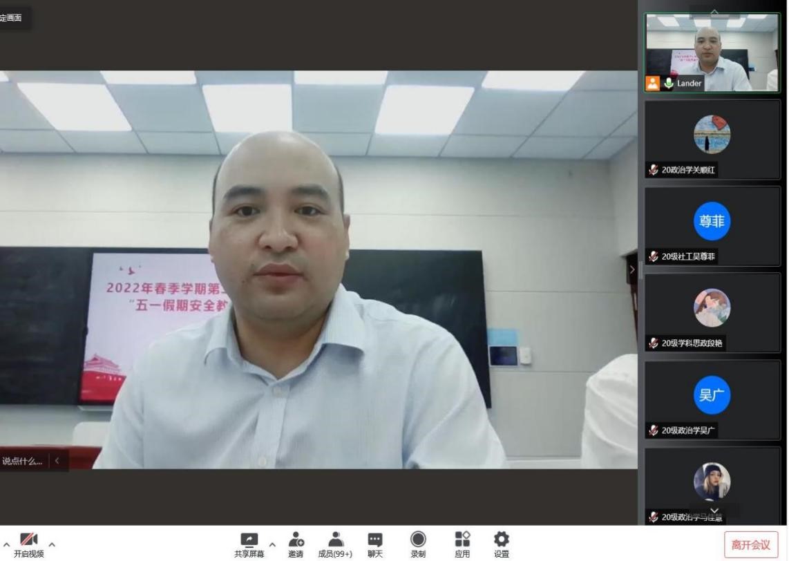 (通讯员 肖伟)在五一假期来临之际,为推动我院安全教育工作顺利开展,增强学生安全防范意识,我院结合当前疫情防控形势以及学校关于“五一”假期的政策安排,于4月26日下午以腾讯会议的形式面向学院全体研究生召开“五一假期安全教育”线上会议。学院副院长李超民教授、研究生办公室主任陈怡老师、辅导员胡耀飞老师出席此次会议。我院500多名研究生参与会议,会议由胡耀飞老师主持。