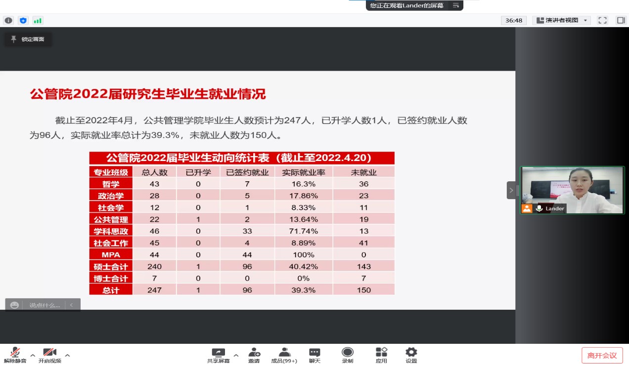 在请假、离长问题上,胡老师提醒同学们放假期间要谨慎出行,非必要不离长,严格配合疫情防控工作,若有特殊情况确需离长须提前报备,填写《离长申请书》,经家长同意—导师知情—研办报备—防控办审批形成完整的请假流程,对擅自离长且不及时请假的学生,依据疫情期间相关条例给予立体化严肃处理。随后,胡老师宣读了五一期间相关注意事项并呼吁各位同学积极参与2020与2021级年级3主席的竞选。最后,陈怡老师就我院19级研究生目前就业情况报告进行解读。她表示,今年毕业人数与往年相比增加了一百六十七万,就业形势非常严峻,要求准毕业生深刻分析当前严峻的就业形势,结合自身实际正确定位就业目标与方向,充分提升就业能力,加强与导师的沟通交流,增强就业信心,把握就业时机,为求职做好充分准备。