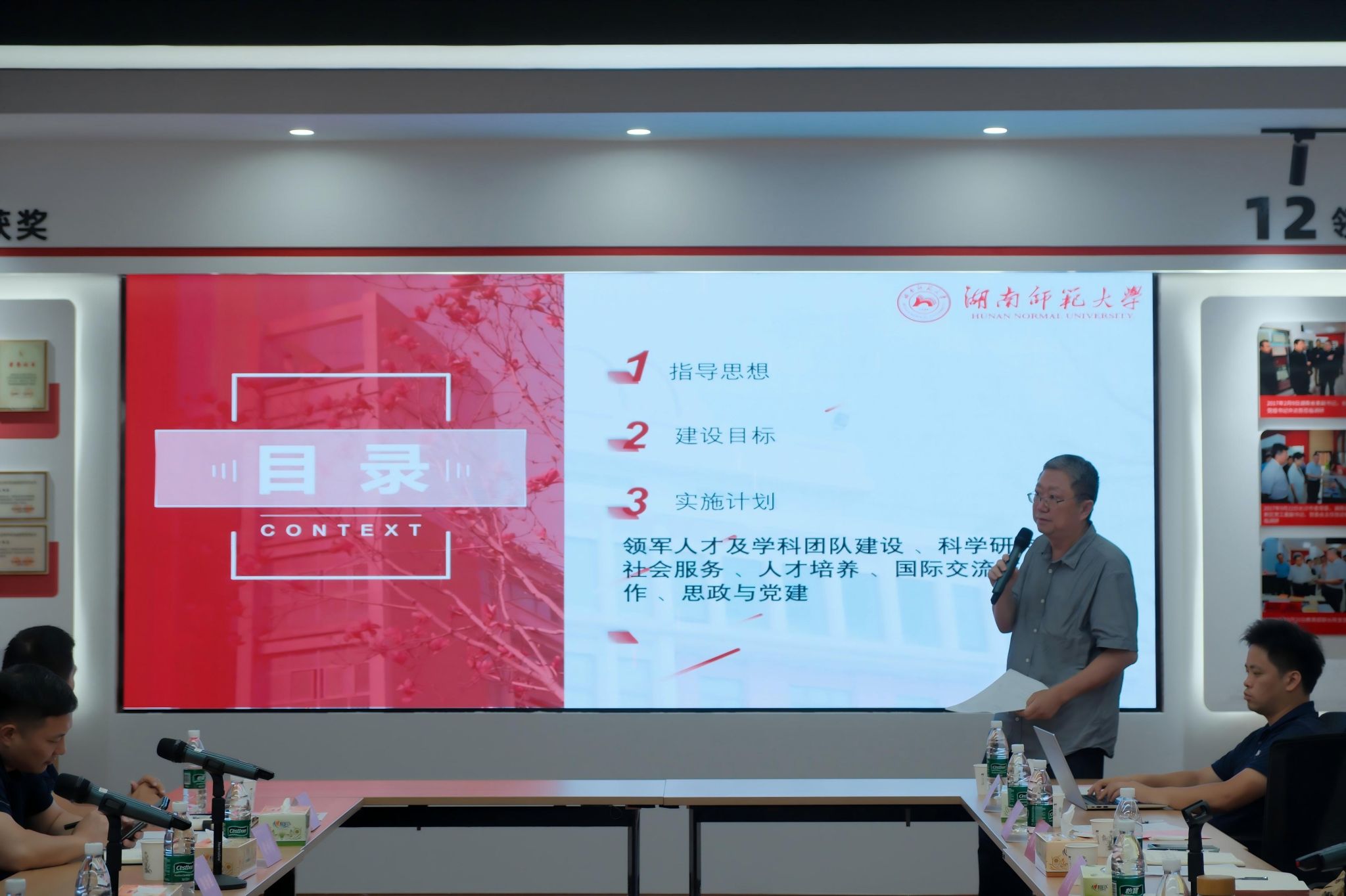 随后,学院院长、哲学学科负责人毛新志教授从365英国目标、成果现状、存在问题、推进计划、所需支持五个方面汇报365英国工作实施方案。通过详实的数据分析,毛院长指出,近五年哲学学科在人才培养、科学研究及智库建设等领域已取得显著成效,但也面临教师高层次人才和高显示度成果偏少、国际化程度低等问题。就此,他从党建、人才培养、科研、师资建设、社会服务、国际交流等方面提出了具体的解决方案。