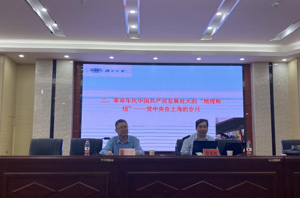 随后,贺东航教授以“革命年代中国共产党发展壮大的‘地理枢纽’——党中央在上海的岁月”为主题作了学术讲座。讲座伊始,贺教授提出:为什么中国共产党自“一大”起至1931年底,党中央一直设在上海?随后他通过梳理大量的历史资料,从地理枢纽的特点、法租界的隐蔽性安全性以及中共中央在上海领导全党艰苦卓绝的斗争史做了回应,回溯了当时中共中央的交通制度、特派员制度等制度的起源,并着重介绍了在上海时期党中央与各红色根据地之间的交通制度和“红色交通线”,探讨了周恩来在上海开创的隐蔽战线活动,以及吴石将军、朱枫烈士等为代表的隐藏战线的巨大功绩。